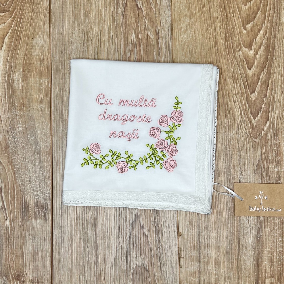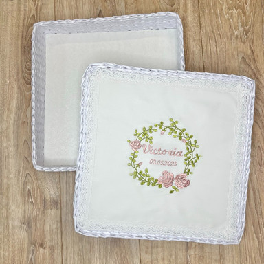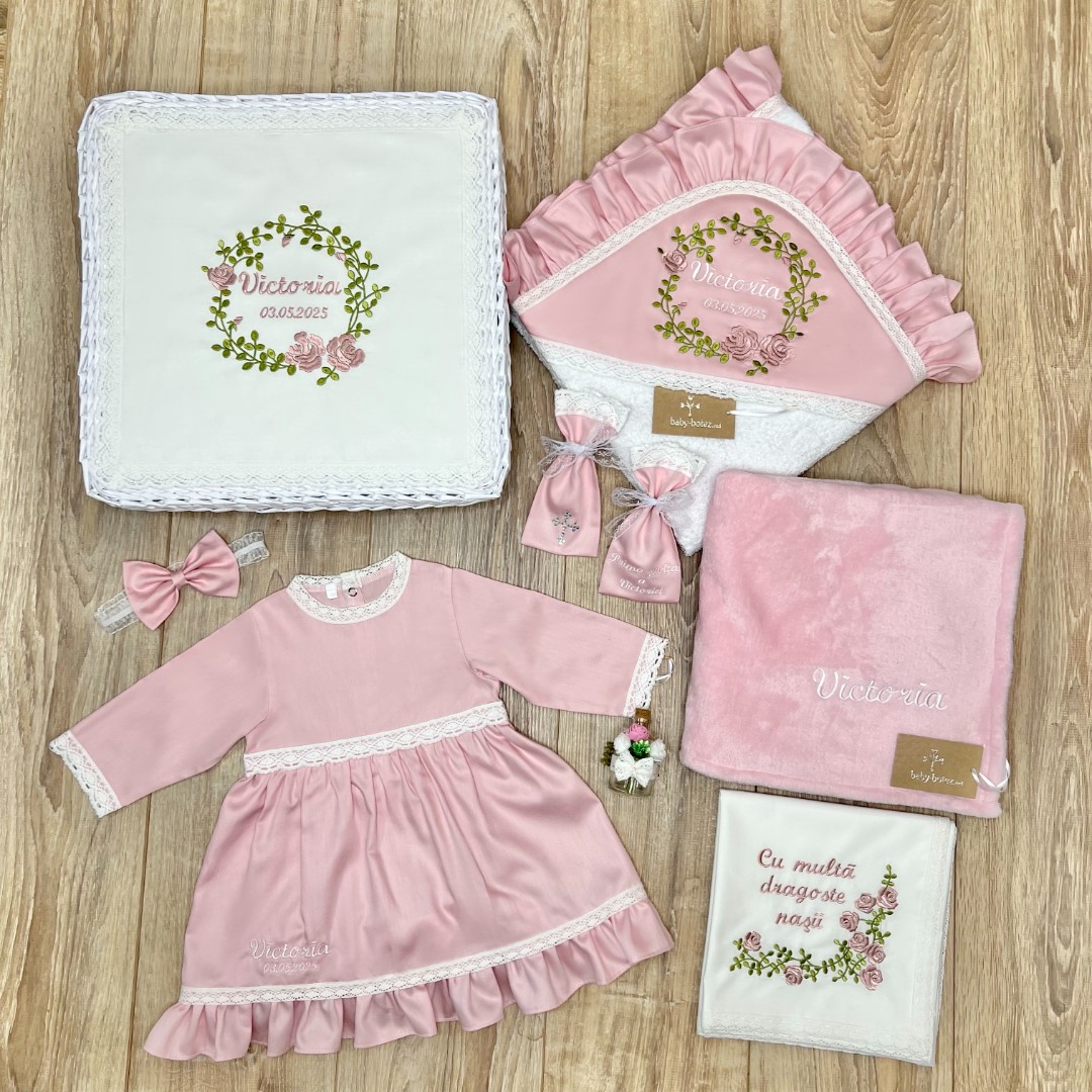 Состав полотенце с уголком, платье, ленточка, пледик, пеленка, мешочек для крестика, мешочек для локона, баночка, плетеная коробка