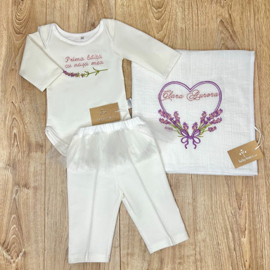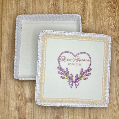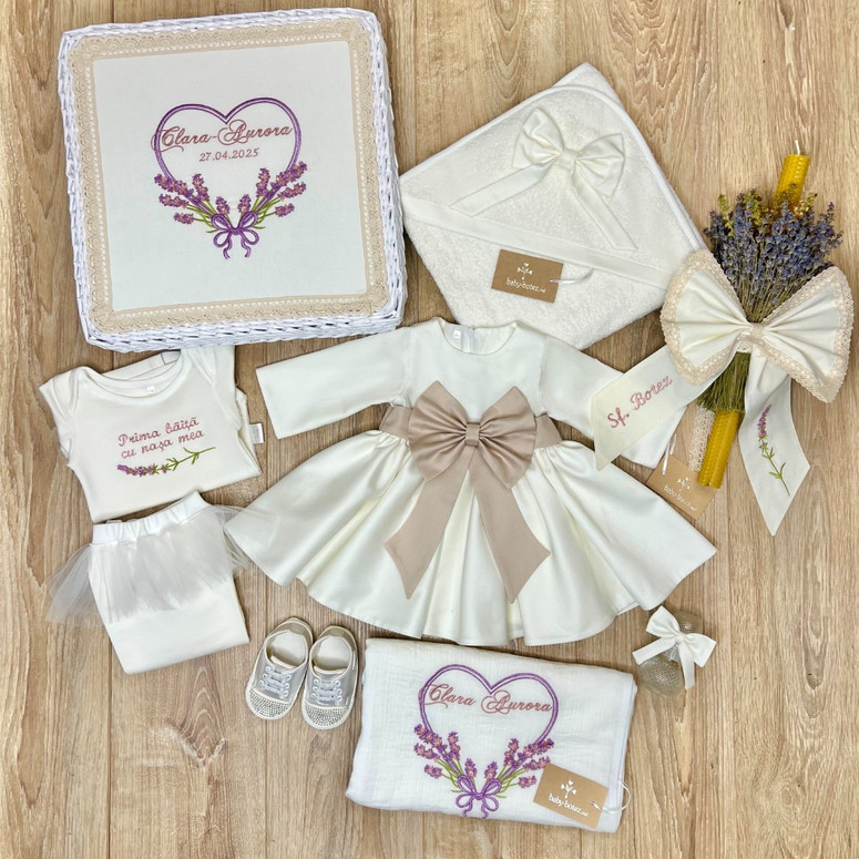 | Состав | полотенце с уголком, платье, пелёнка, костюм для первого купания, кеды, баночка, плетёная коробка, бант для крыжмы, свеча с лавандой и бусуйком |
