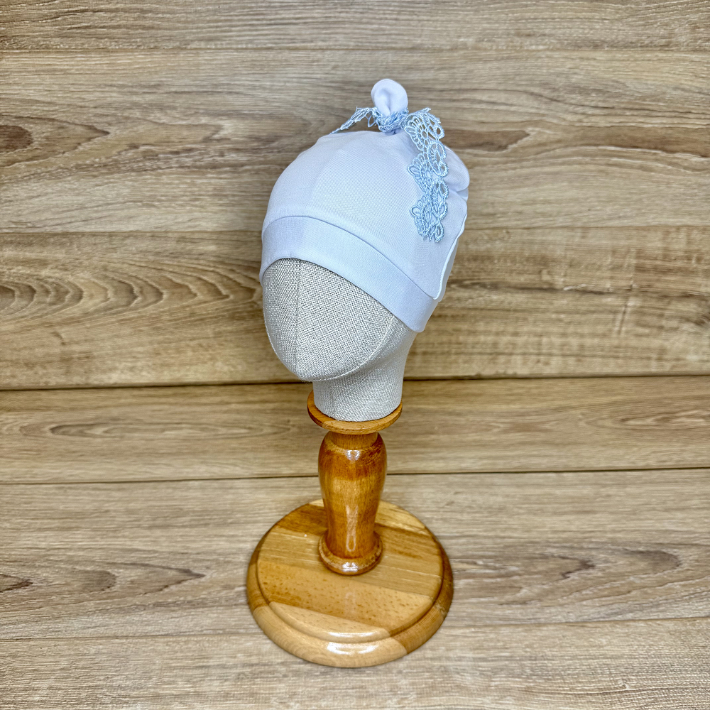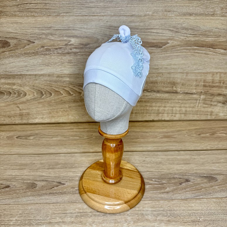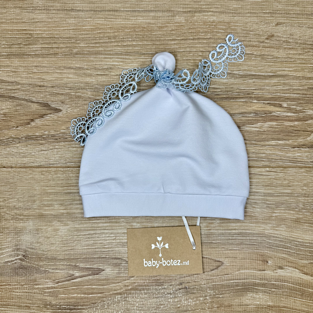 Описание шапочка из трикотажа, декорирована кружевной лентой