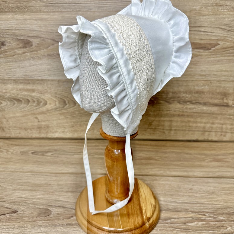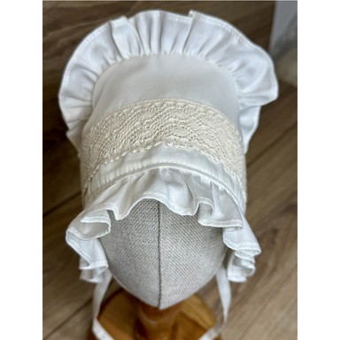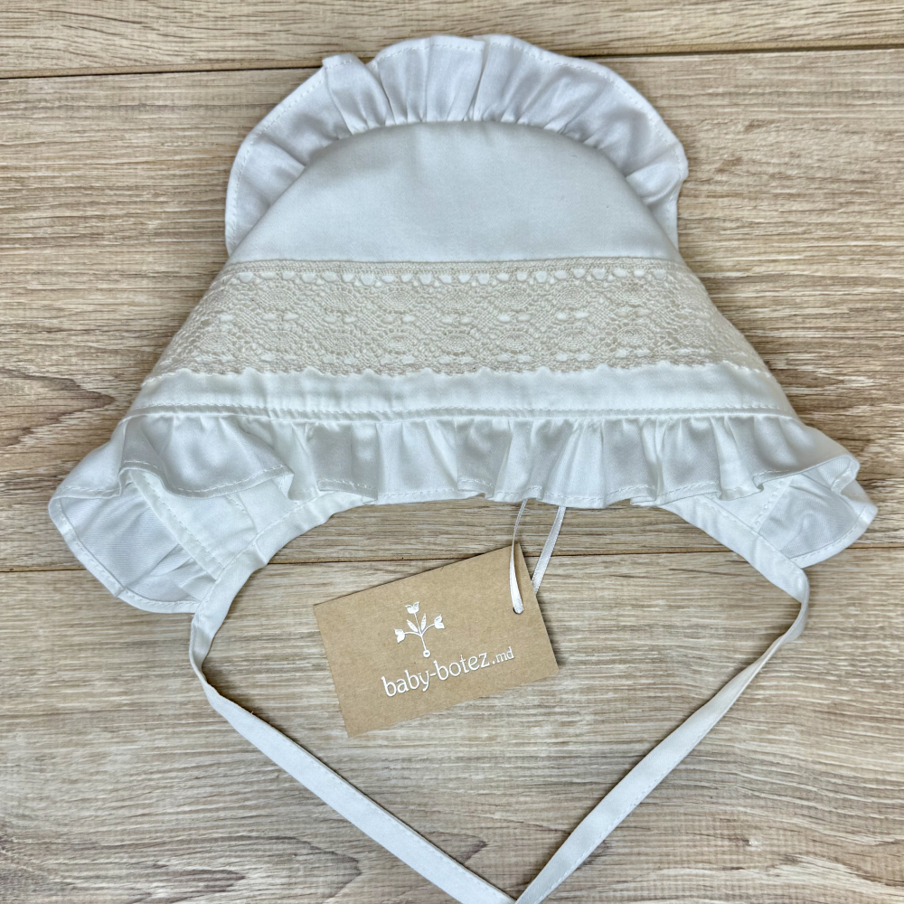 Descriere căciuliță cu volănașe, decorată cu dantelă tricotată