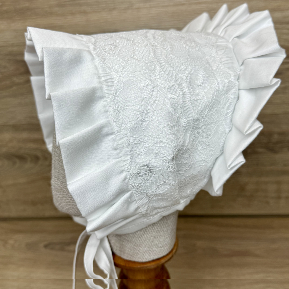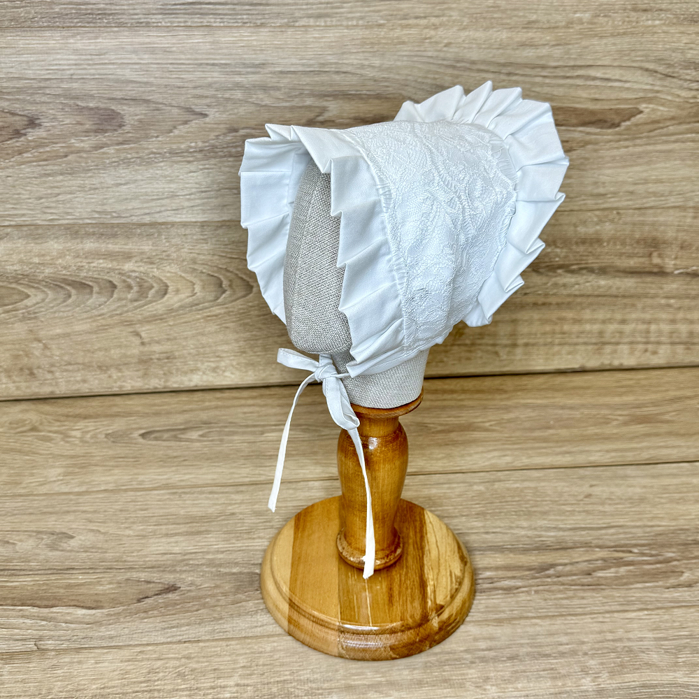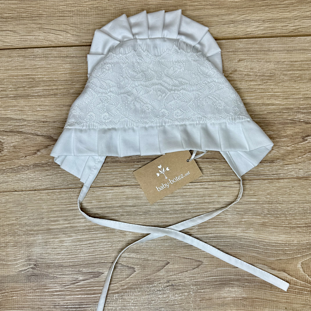 Descriere căciuliță decorată cu pliuri rigide și dantelă franțuzească