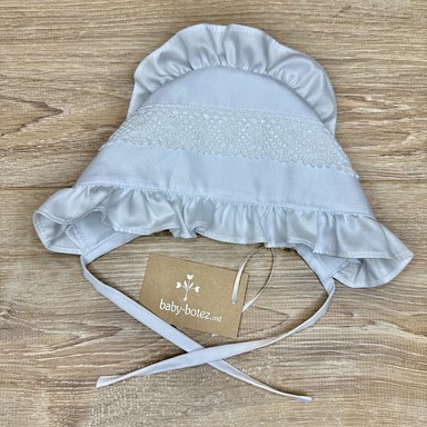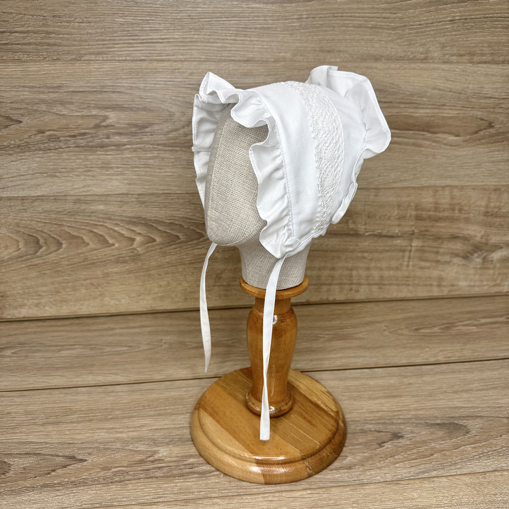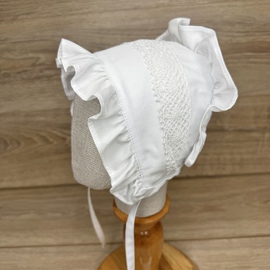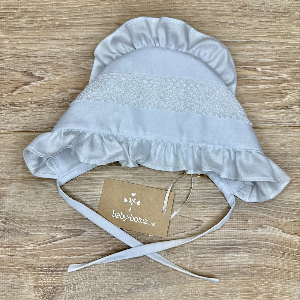 Descriere căciuliță cu volănașe, decorată cu dantelă tricotată