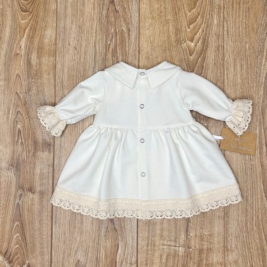 | Descriere | Rochie din tricot, în stil clasic, completată cu guler elegant. Mânecile grațioase se termină cu manșete bogate din dantelă, iar tivul este decorat cu o bandă lată de dantelă ajurată |