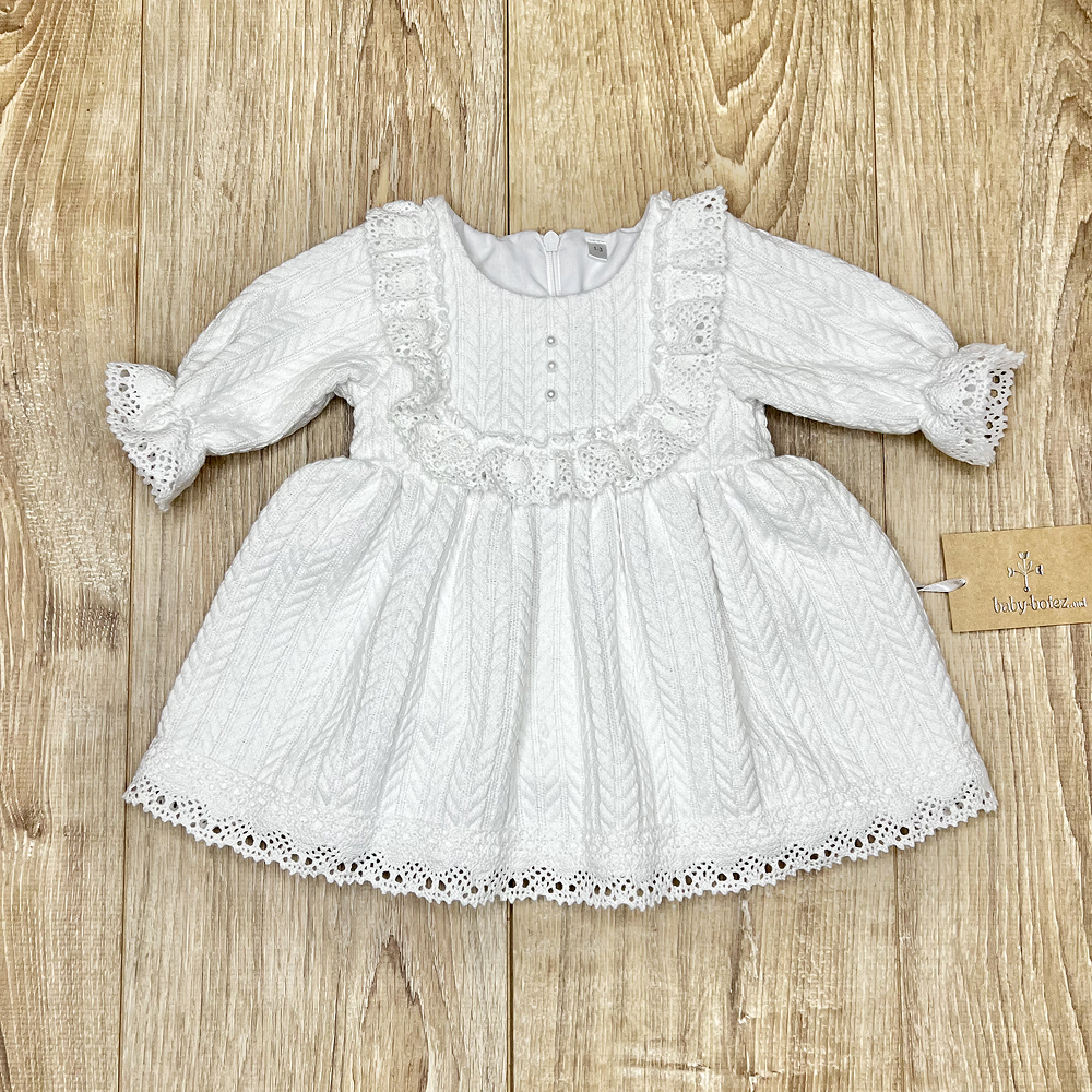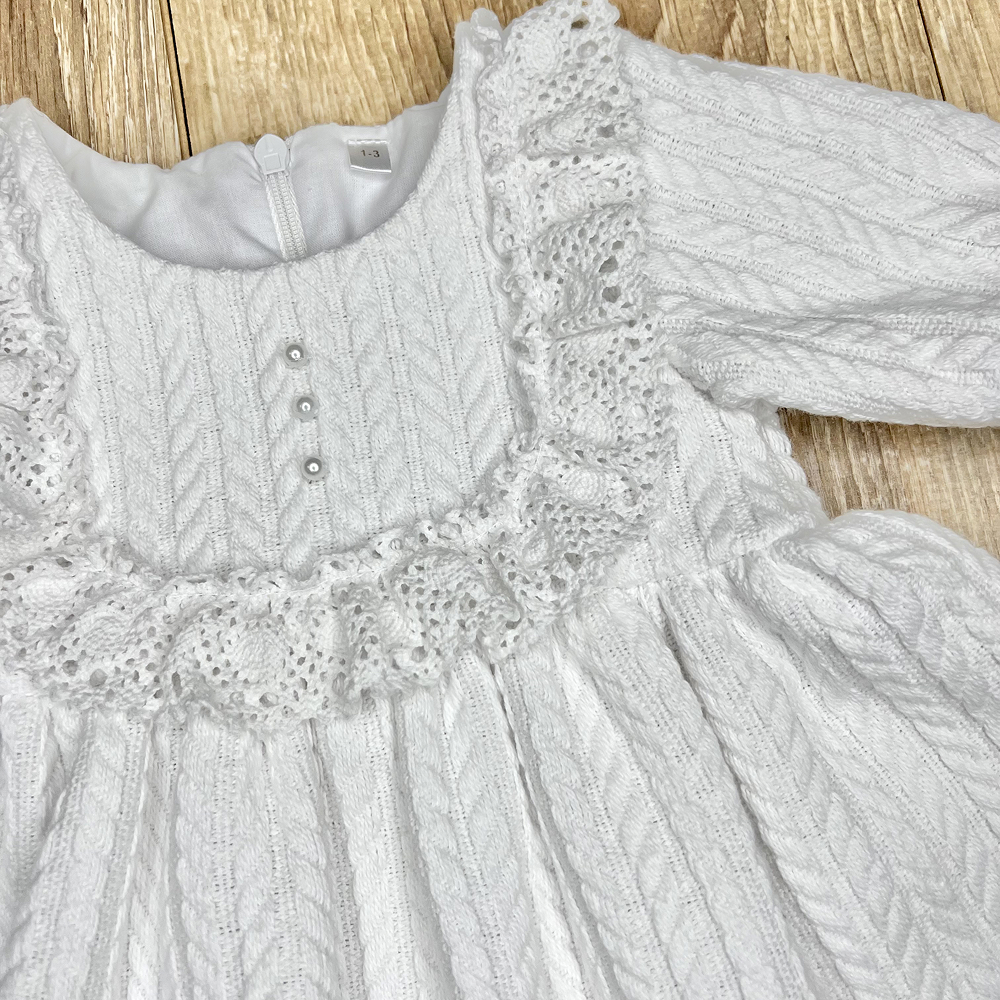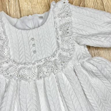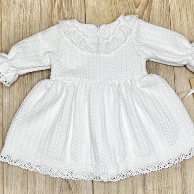 Descriere Rochie fermecătoare și delicată pentru fetiță, îmbinând confortul tricotului cu aerul festiv și ușor al unei ținute de sărbătoare