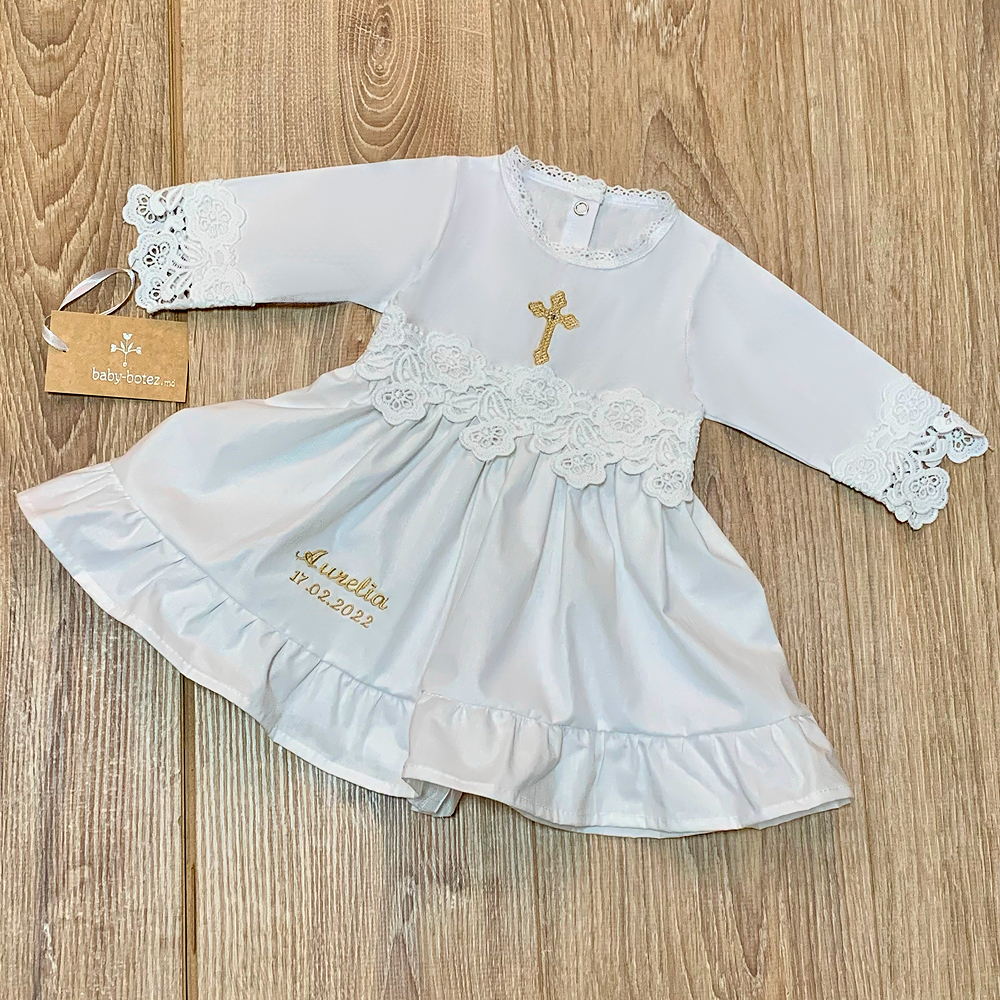 Rochie albă ca zăpada din satin nobil, creată pentru cea mai importantă primă sărbătoare – Taina Botezului. Oferă delicatețe și confort desăvârșit pentru fetiță