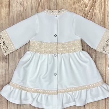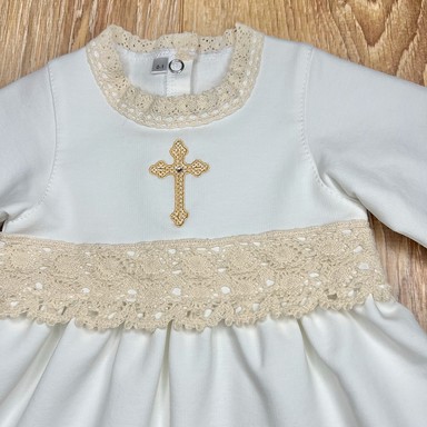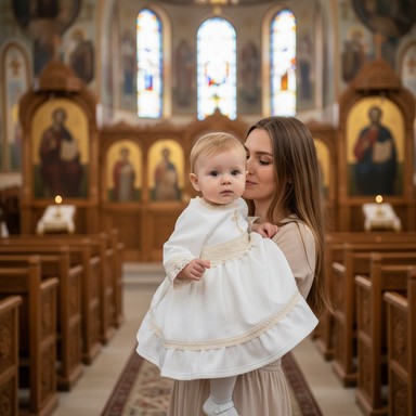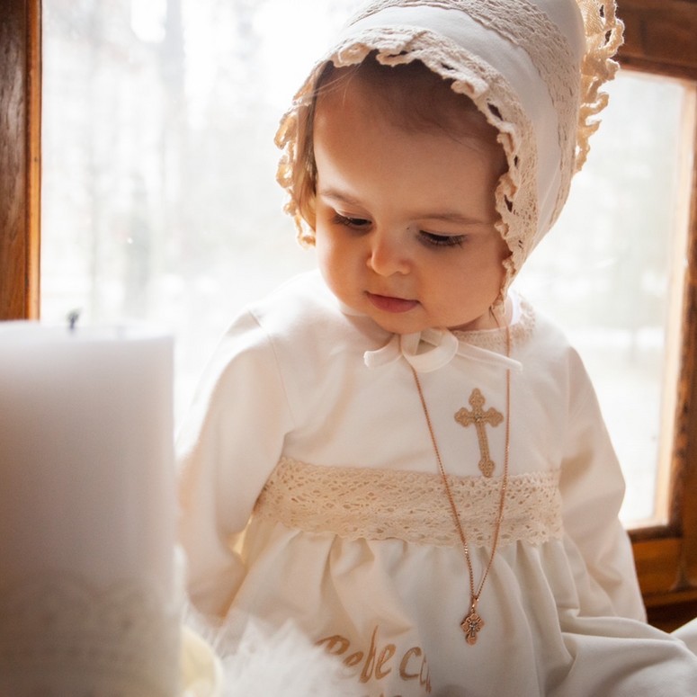 Descriere Rochie festivă pentru botez, realizată în stil clasic, ce îmbină simbolistica sacră cu o estetică delicată