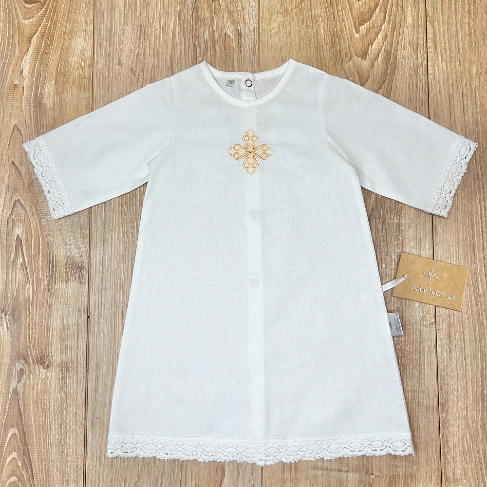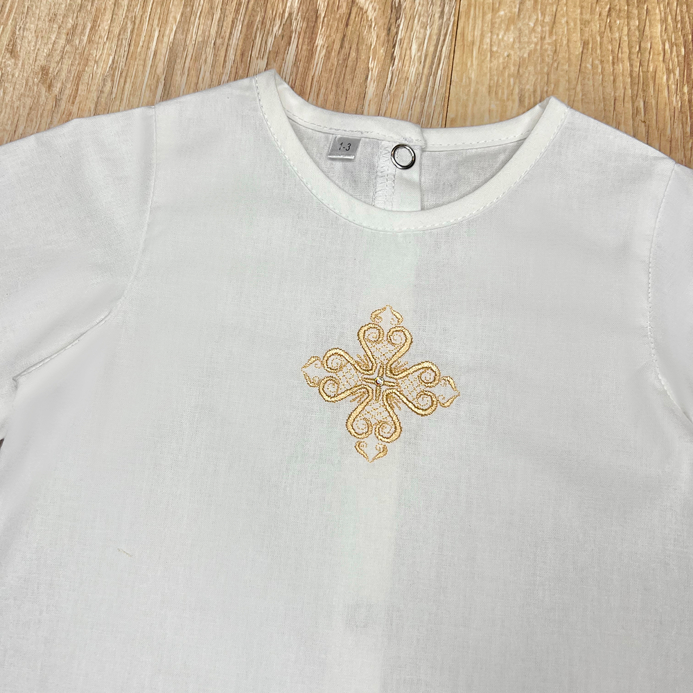 | Descriere | Cămașă clasică de botez, cu croială tradițională, simbolizează puritatea și începutul unei vieți noi. Nu restricționează mișcările bebelușului și se poate îmbrăca ușor după ritualul de spălare |