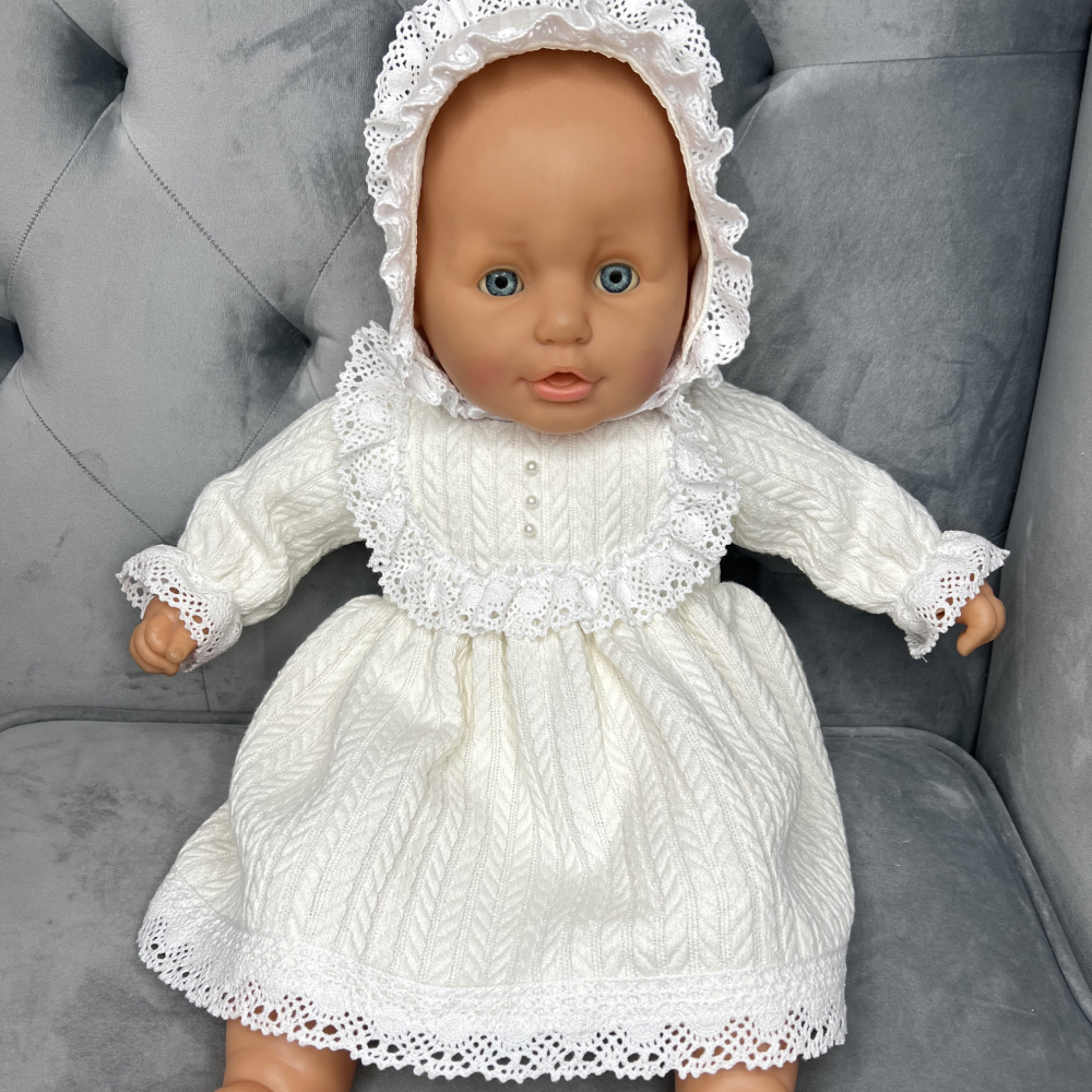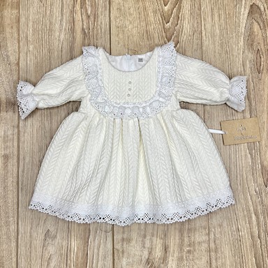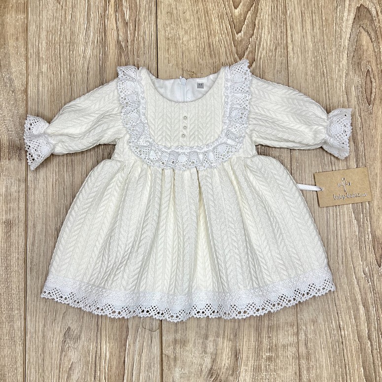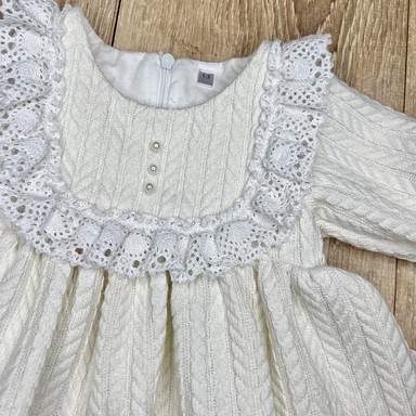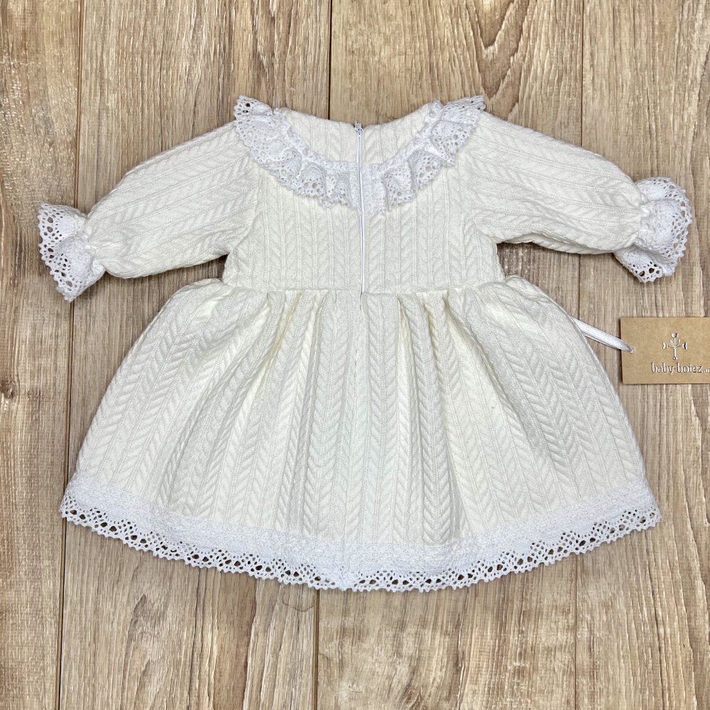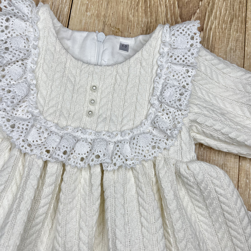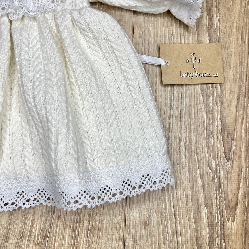 Rochie adorabilă în stil retro, ideală pentru un look confortabil și festiv al fetiței. Realizată din tricotaj texturat moale, cu model clasic „codiță”