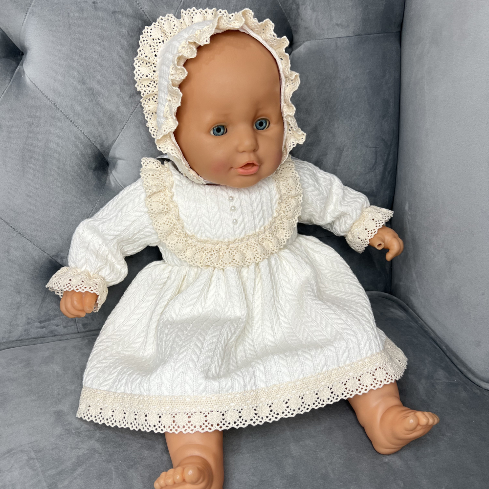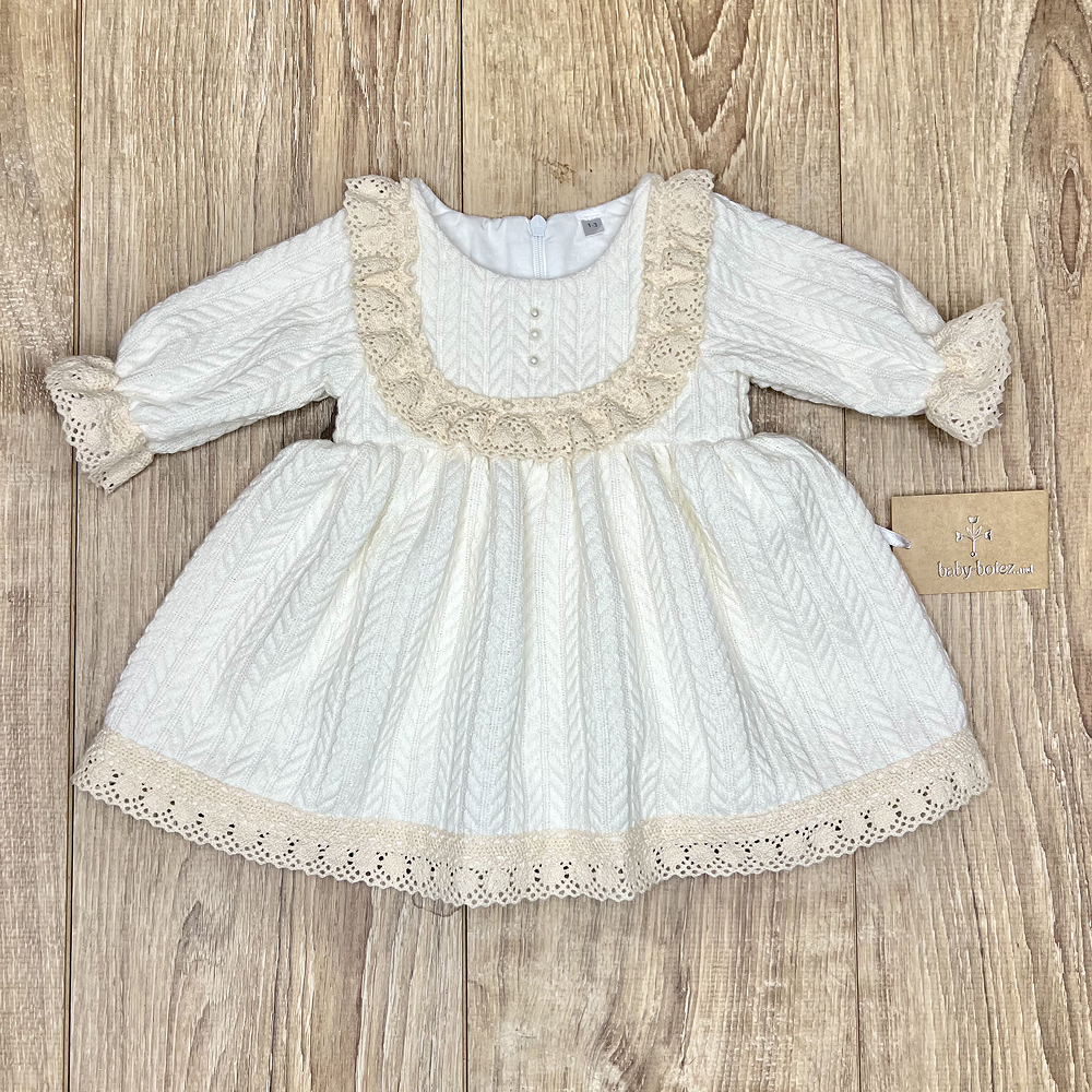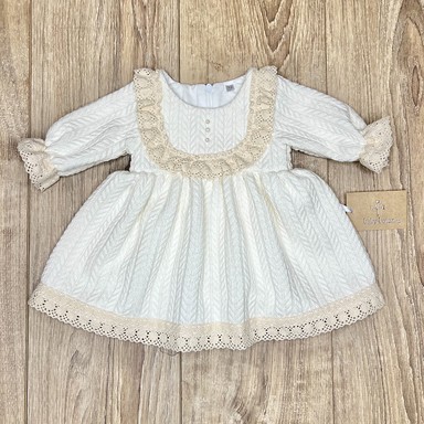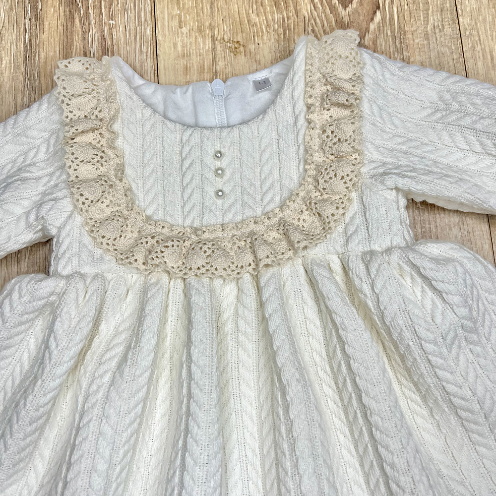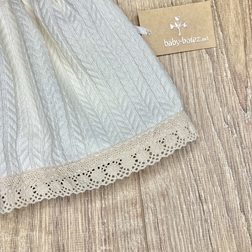 Rochie adorabilă în stil retro, perfectă pentru un look confortabil și festiv al fetiței. Realizată din tricotaj texturat moale, cu model clasic „codiță”