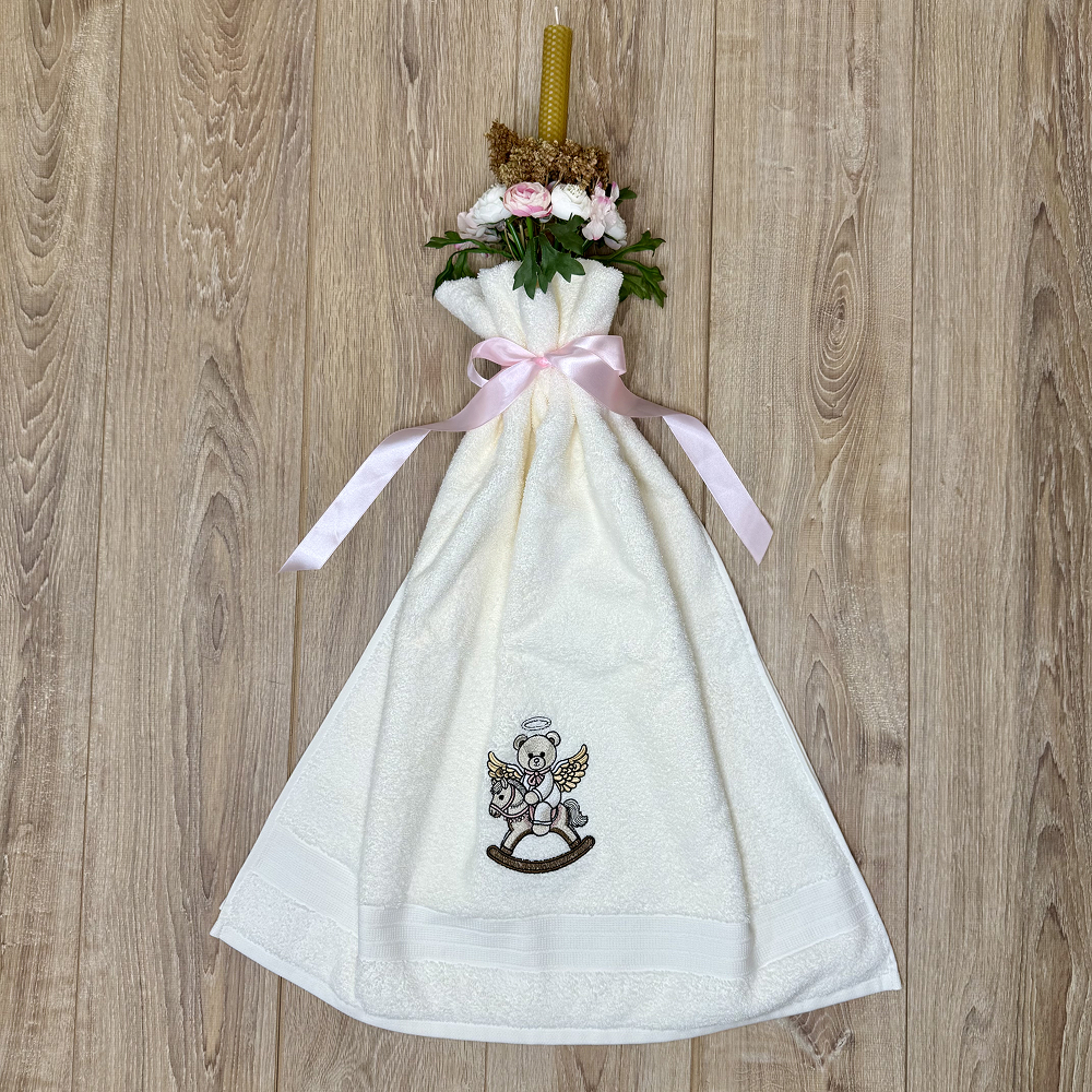 Componență prosop, lumânare din ceară naturală cu busuioc și flori artificiale