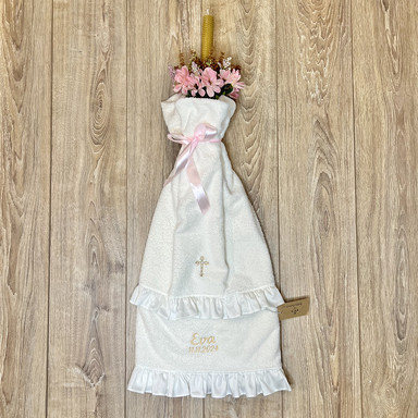 Componență prosop cu volănașe, lumânare din ceară naturală cu busuioc și flori artificiale