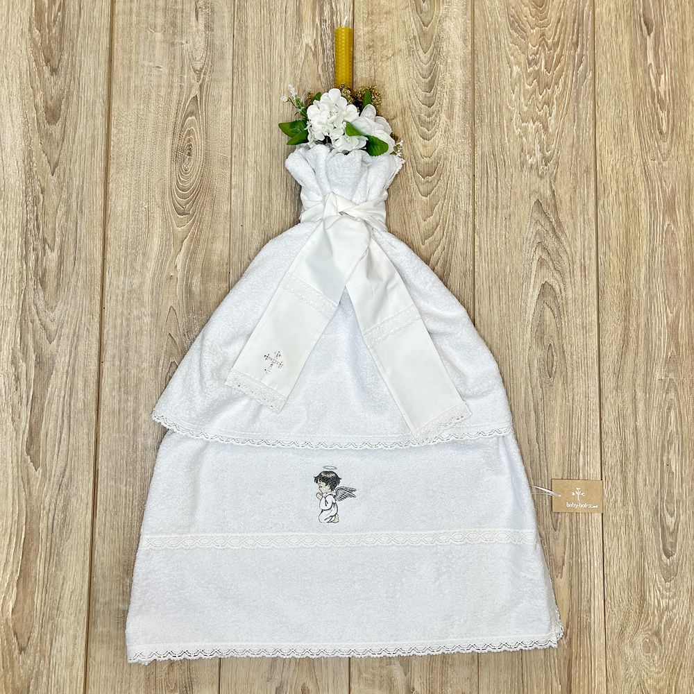 Componență prosop, lumânare din ceară naturală cu busuioc și flori artificiale