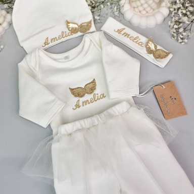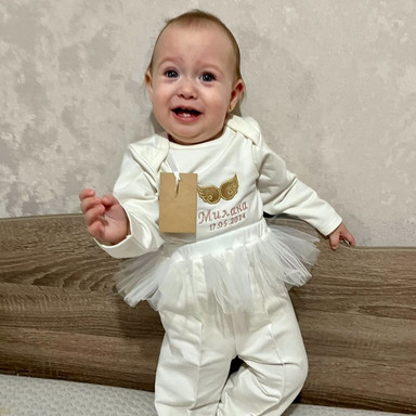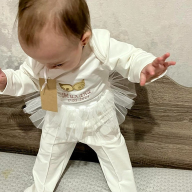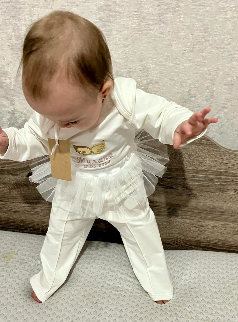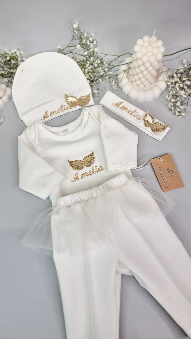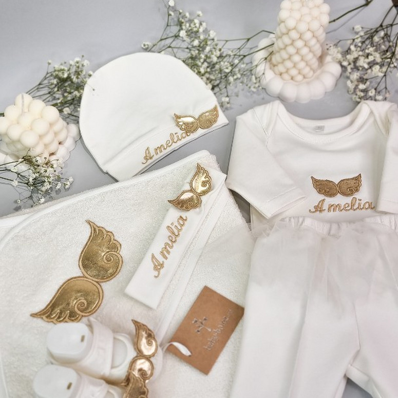 Compoziție prosop cu glugă, costum, căciuliță, fundiță, botoșei