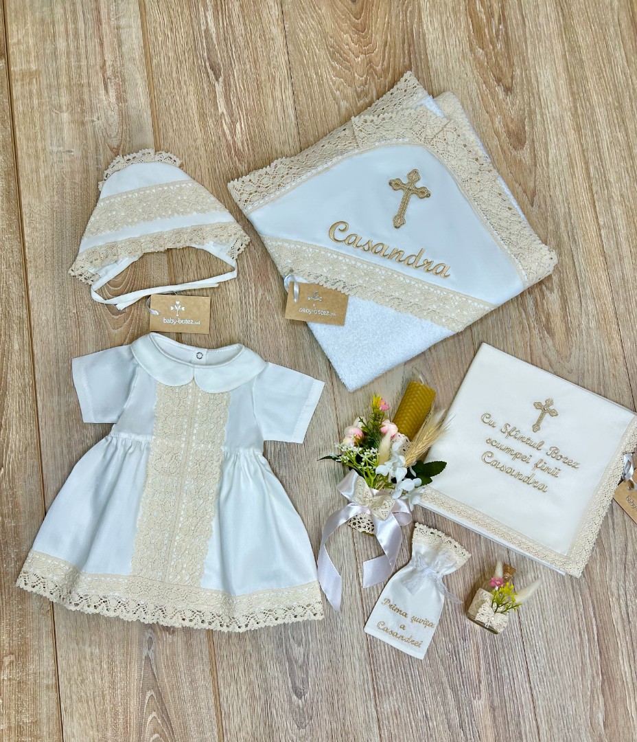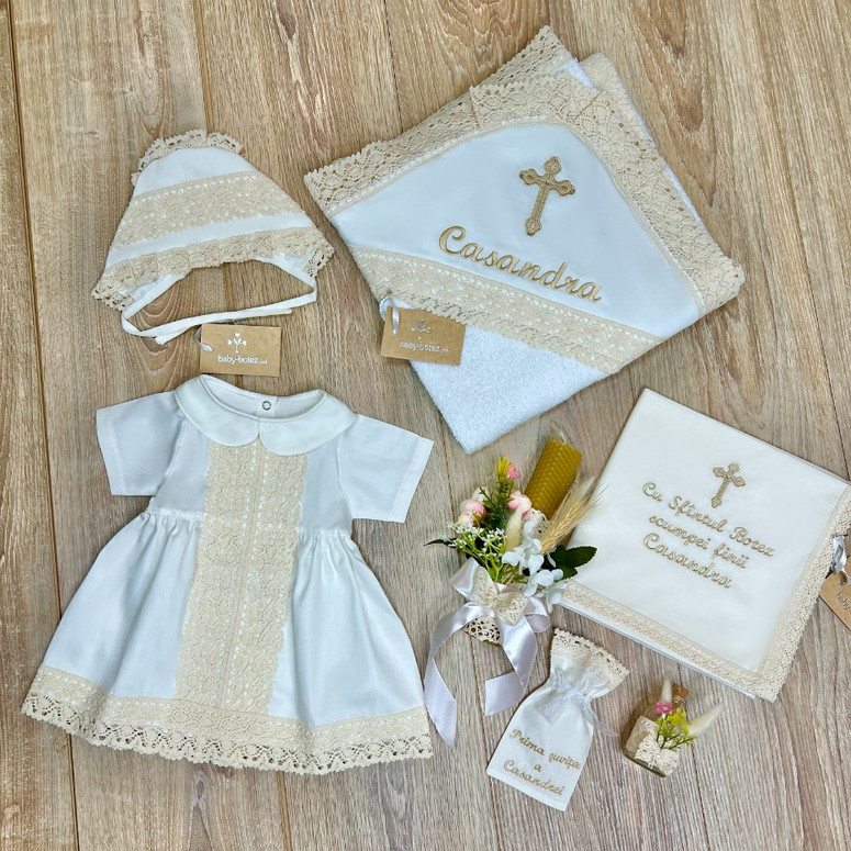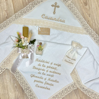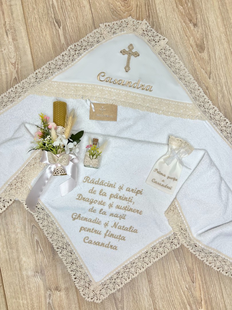 Compoziție prosop, rochiță, bonetă, scutec, săculeț, lumânare decorată, borcănel