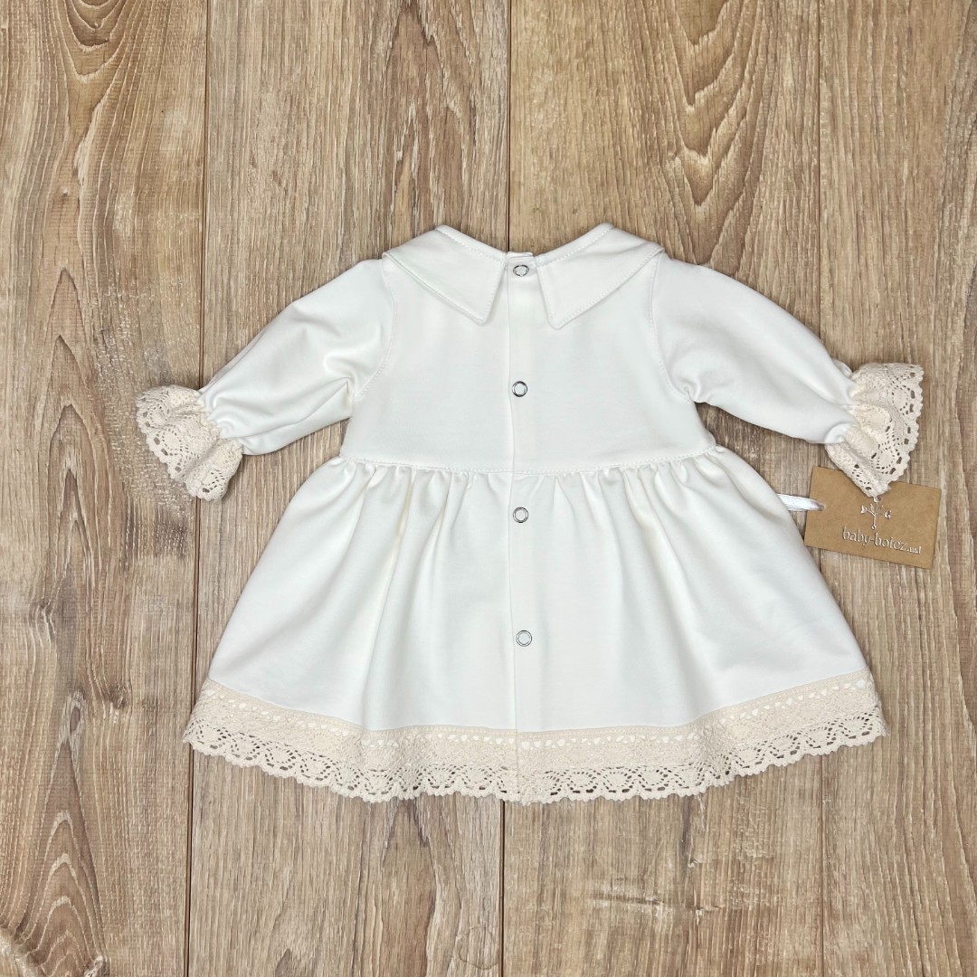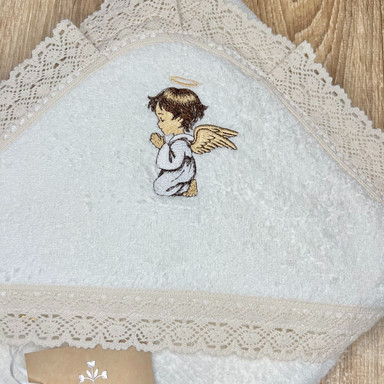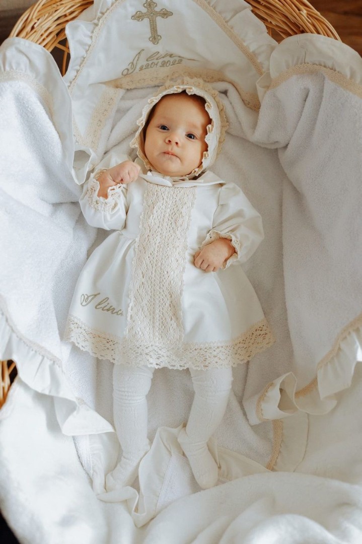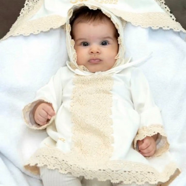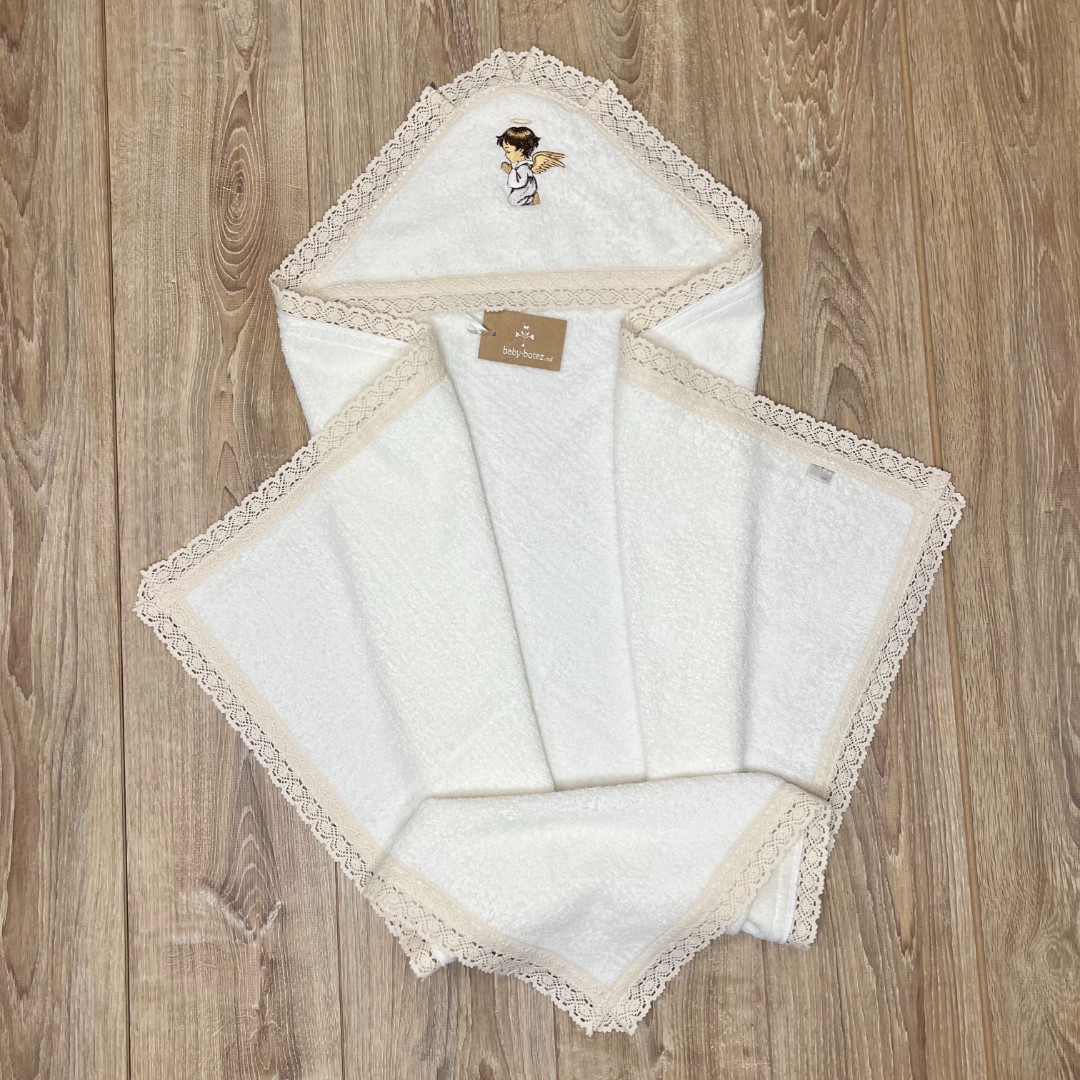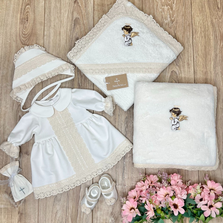 Compoziție prosop cu glugă, rochiță, bonetă, săculeț, scutec, păturică, botoșei