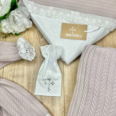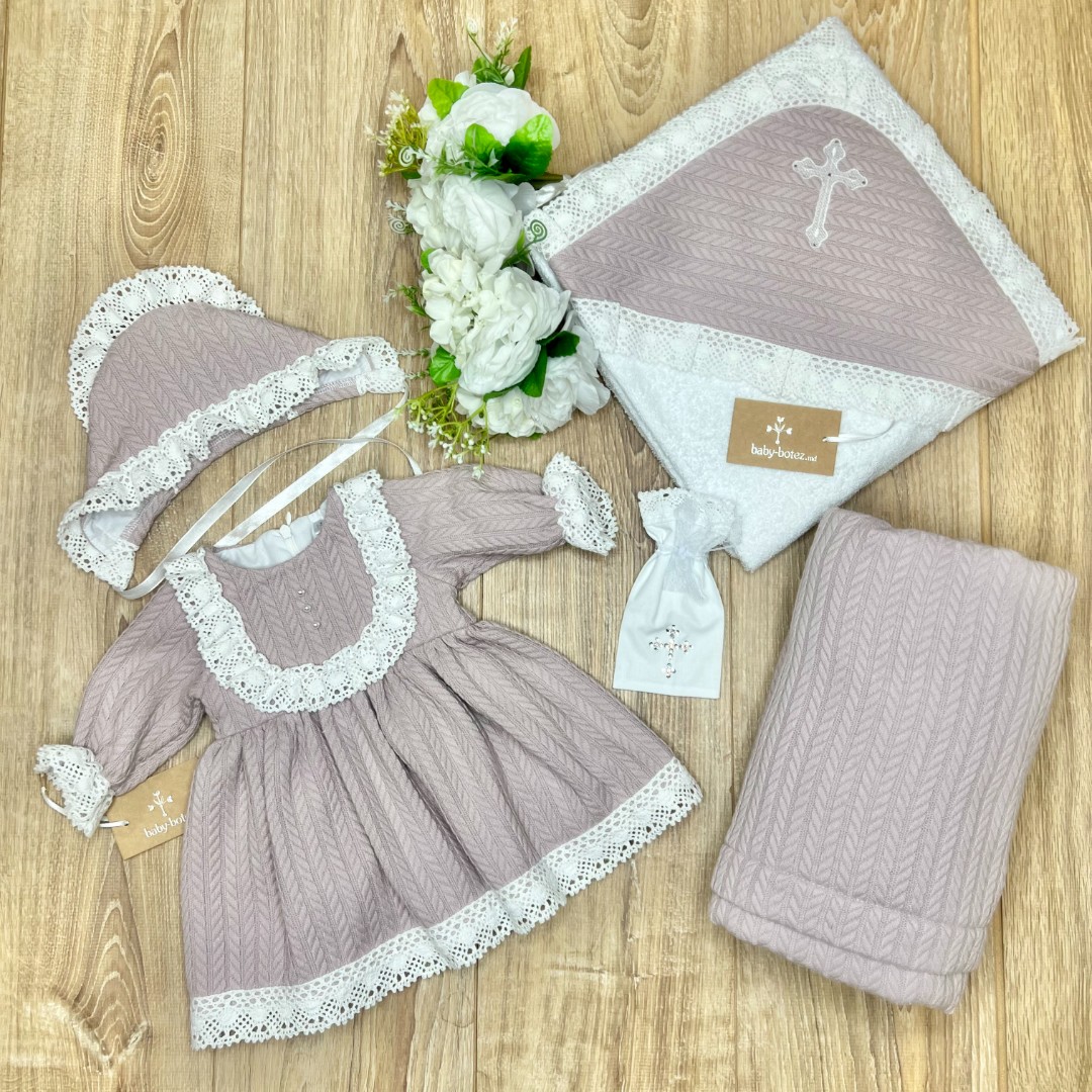 Compoziție prosop cu glugă, rochiță, bonetă, cuvertură, săculeț