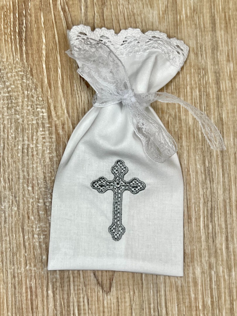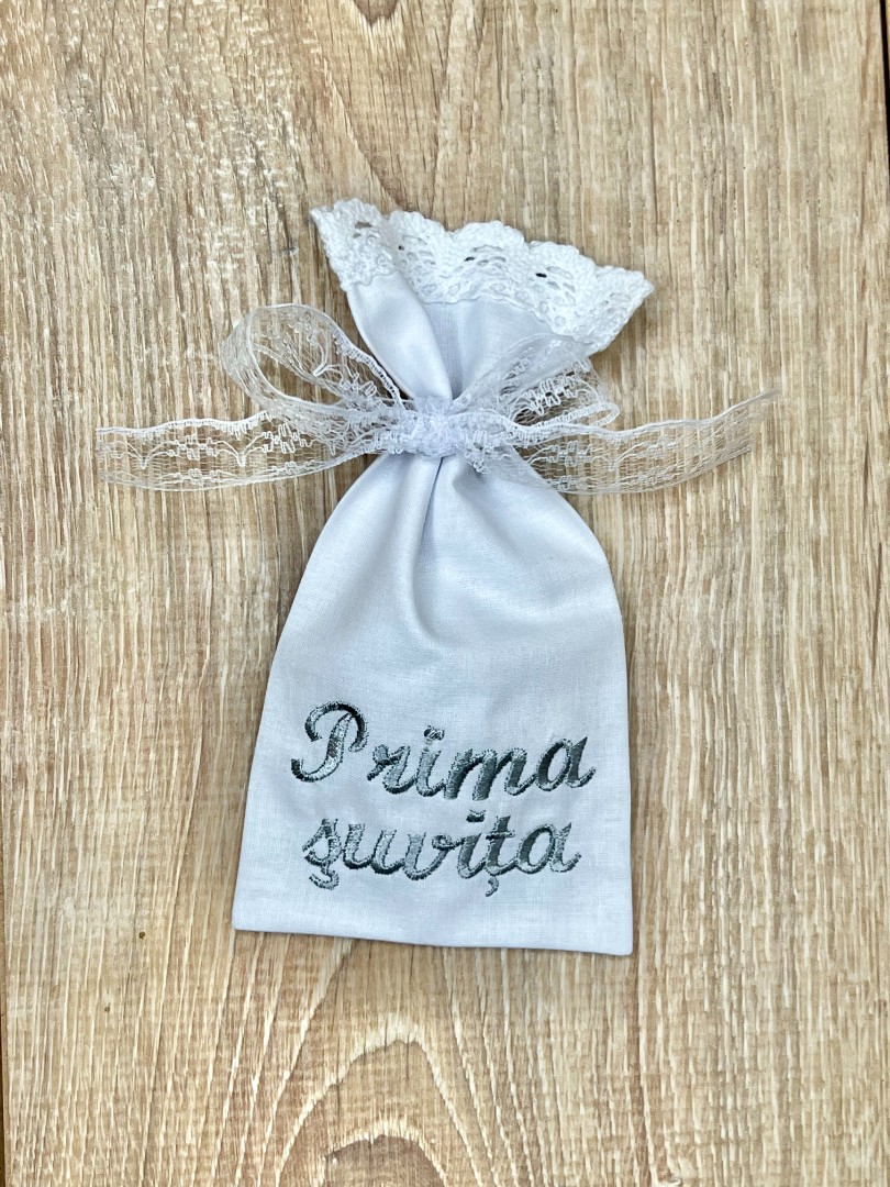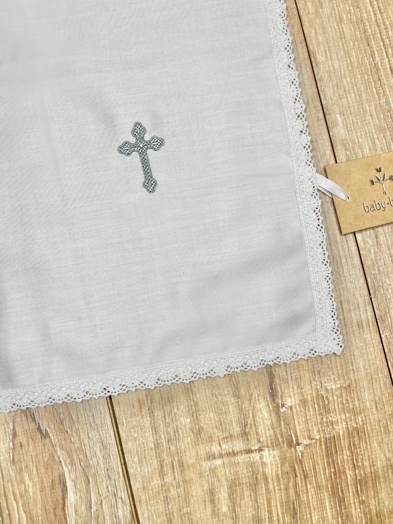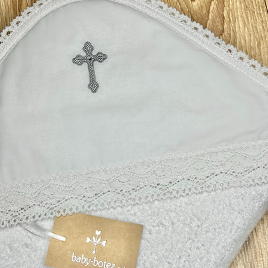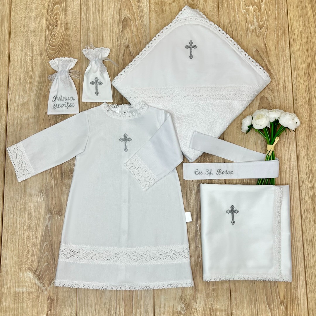 Compoziție prosop cu glugă, cămașă de botez, scutec, săculeț pentru cruciuliță, săculeț pentru prima șuviță, panglică
