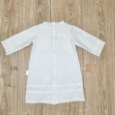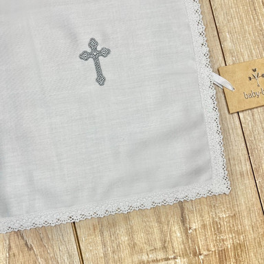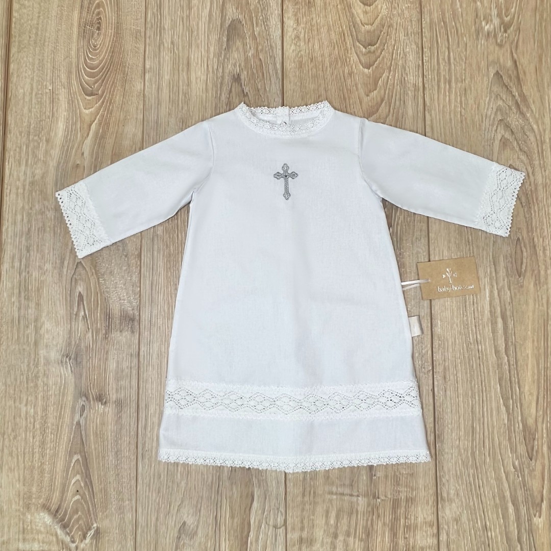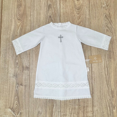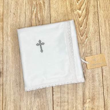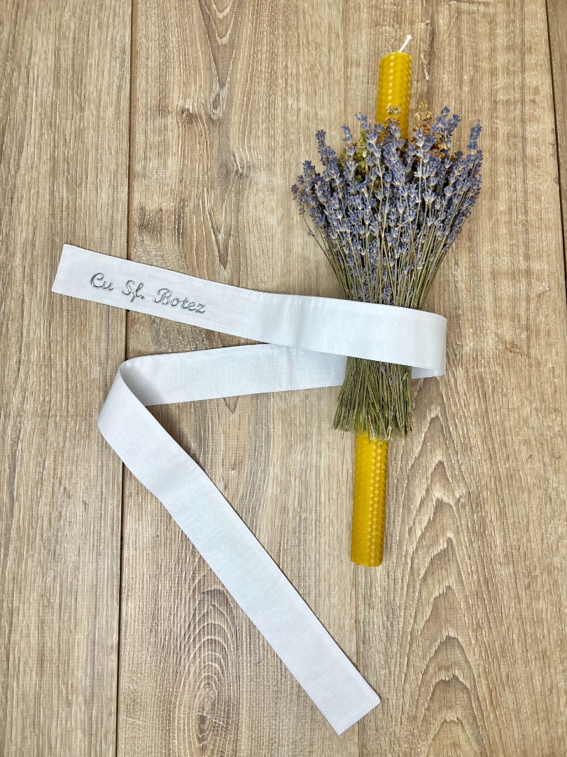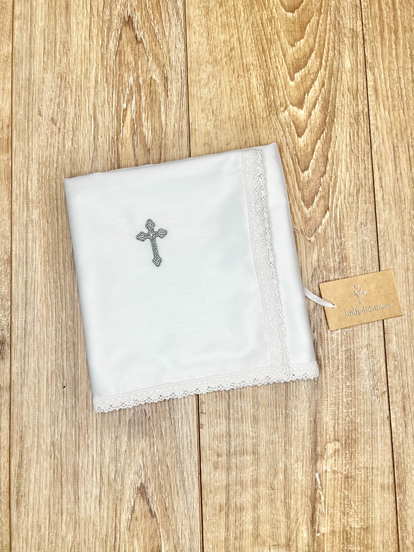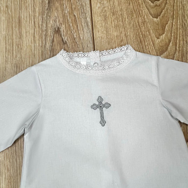 Compoziție prosop cu glugă, cămașă de botez, scutec, săculeț pentru cruciuliță, săculeț pentru prima șuviță, panglică