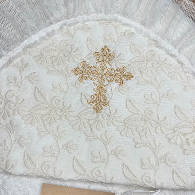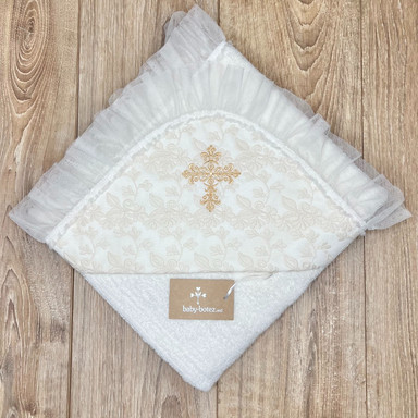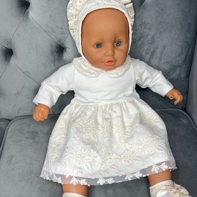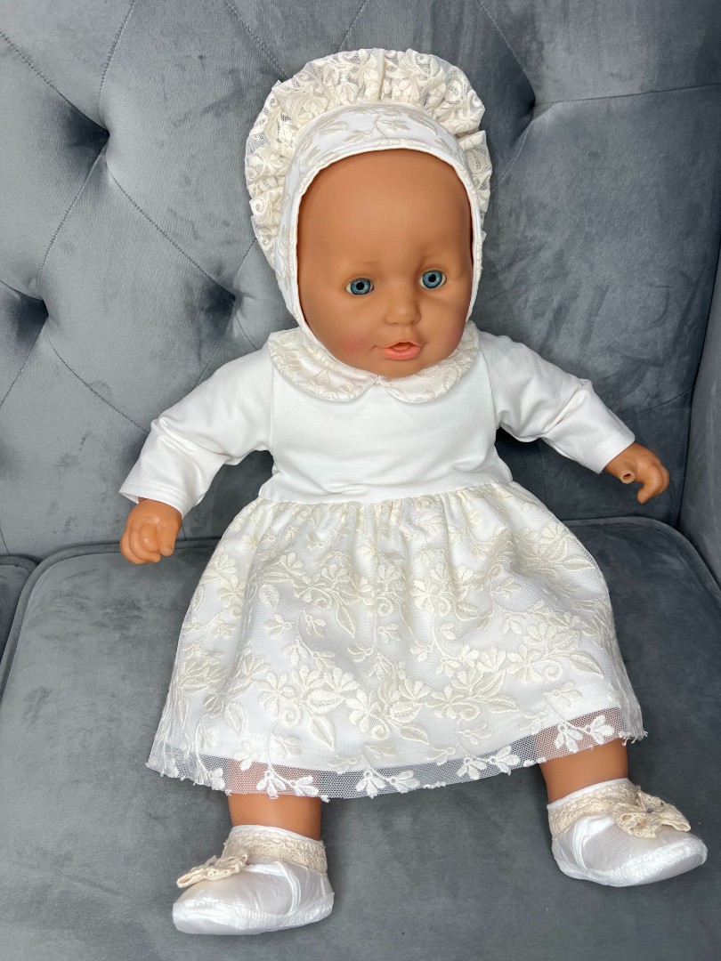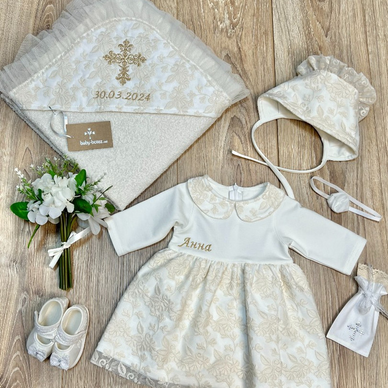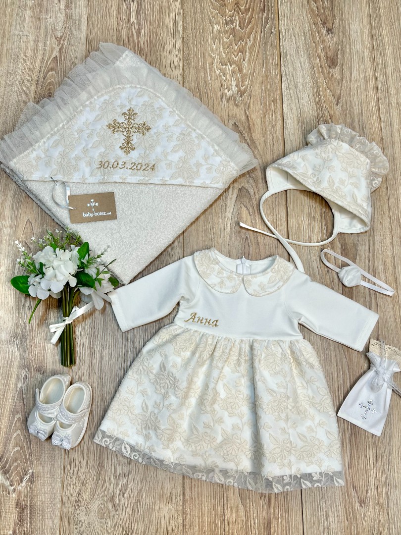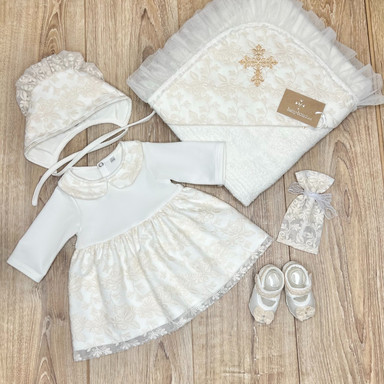 Compoziție prosop cu glugă, rochiță, bonetă, săculeț, botoșei