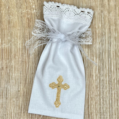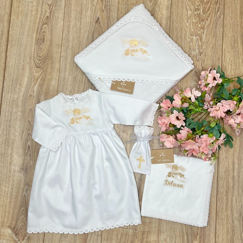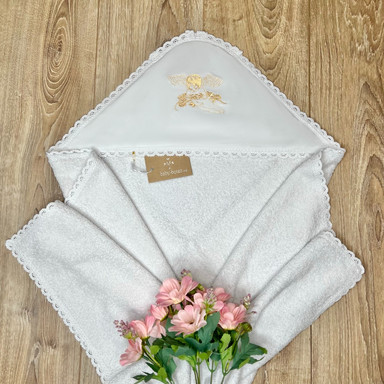 Compoziție prosop cu glugă, rochiță, scutec, săculeț