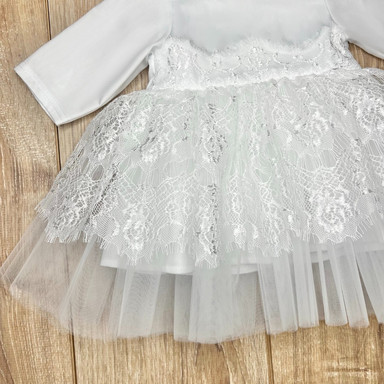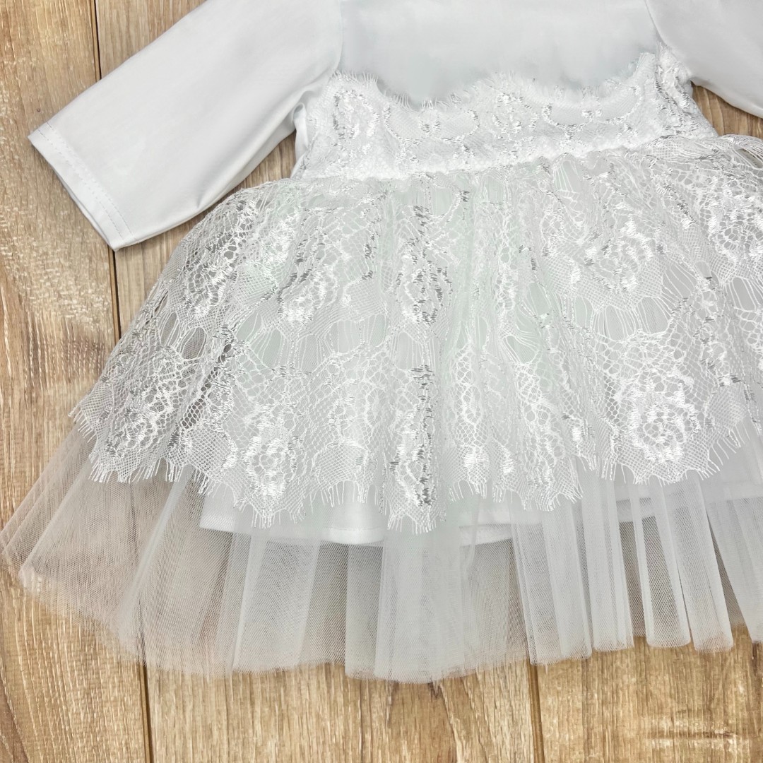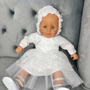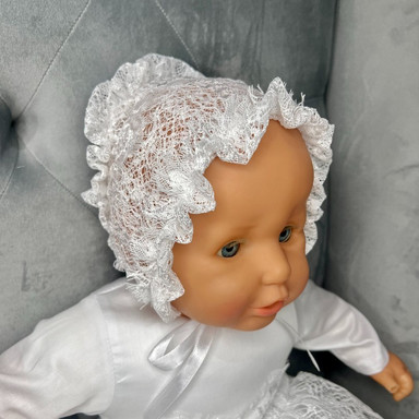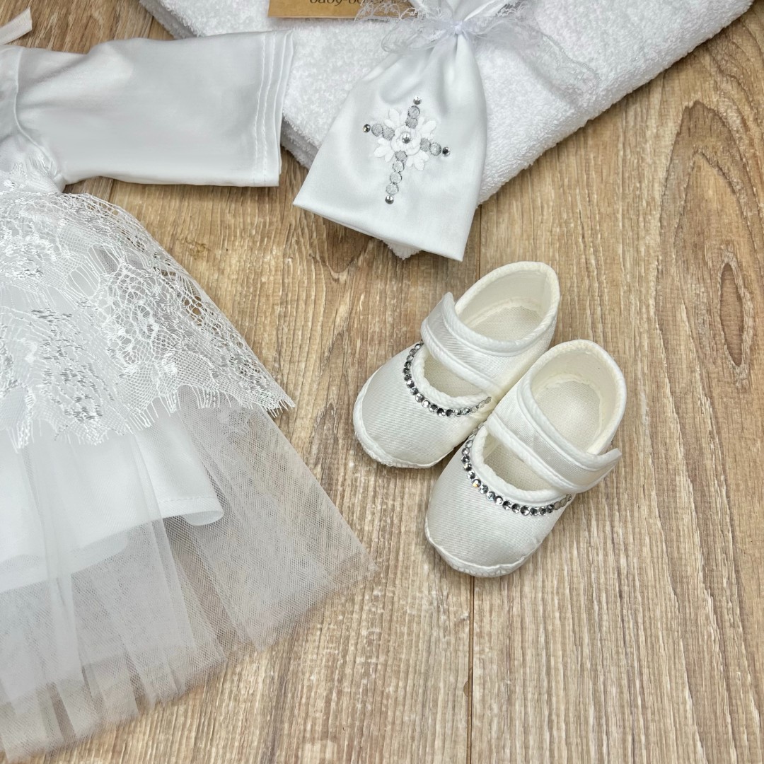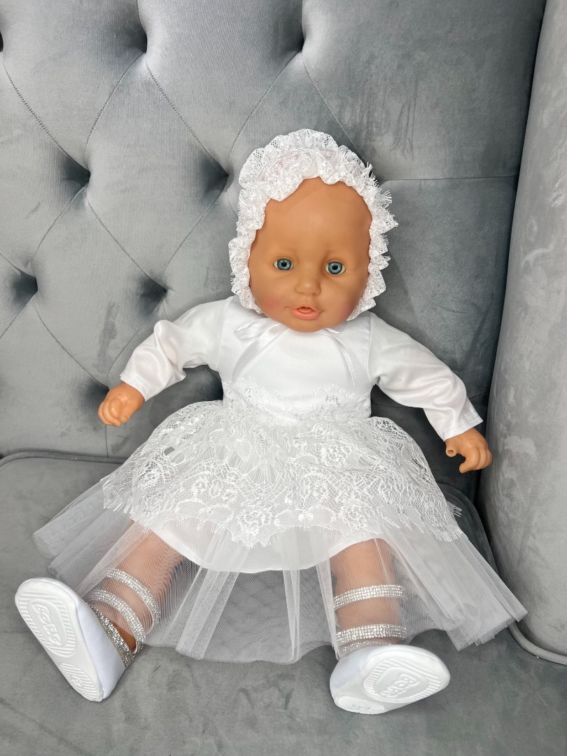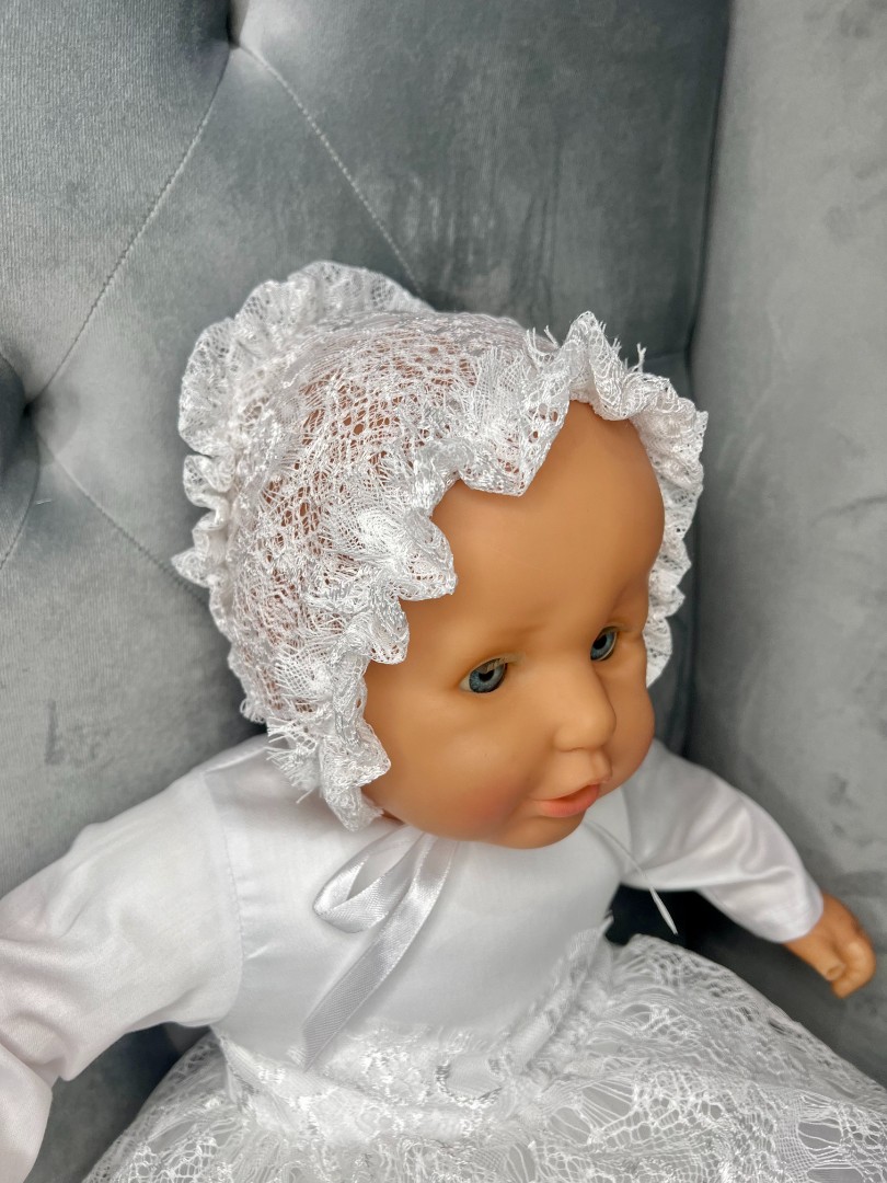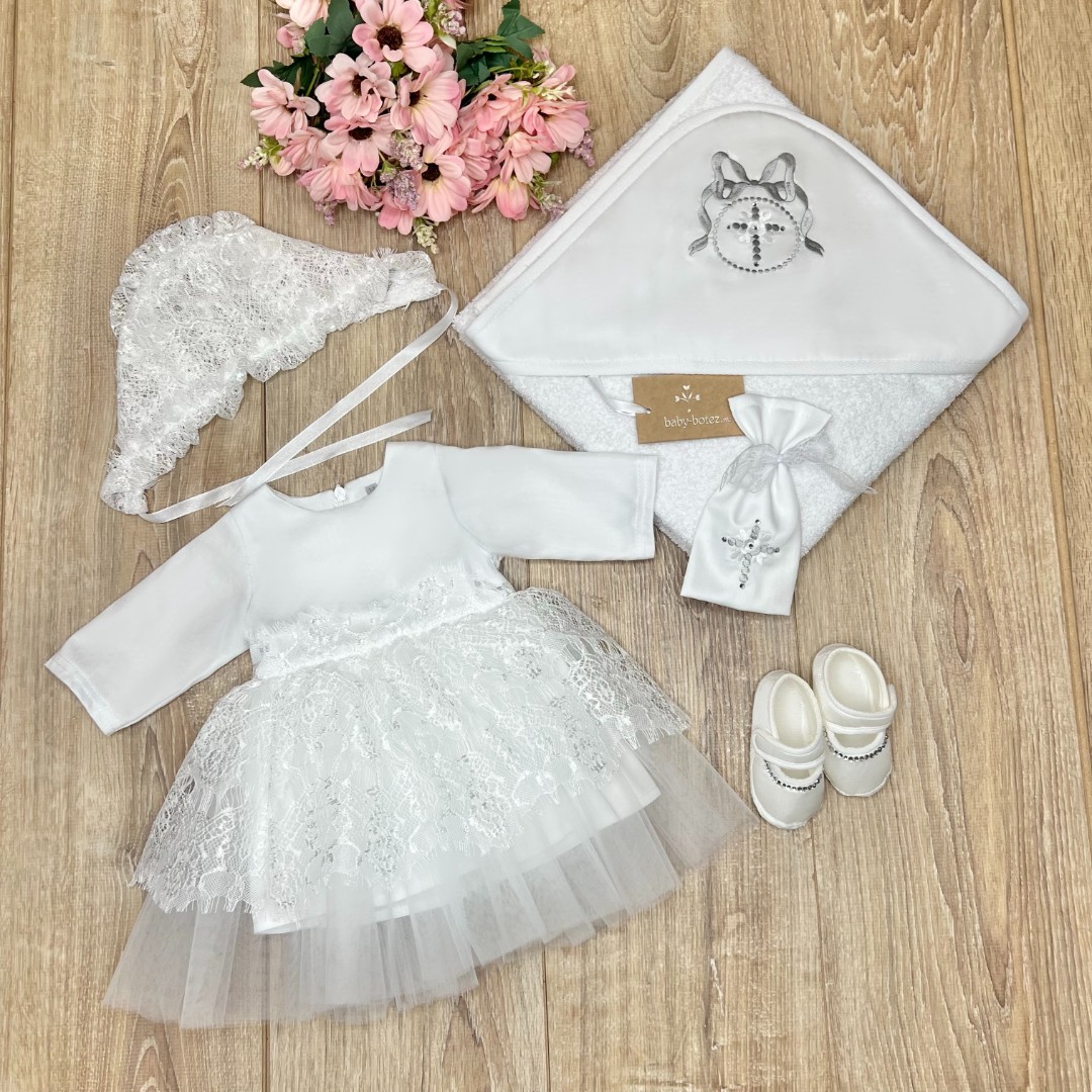 Compoziție prosop cu glugă, rochiță, căciuliță, fundiță, botoșei