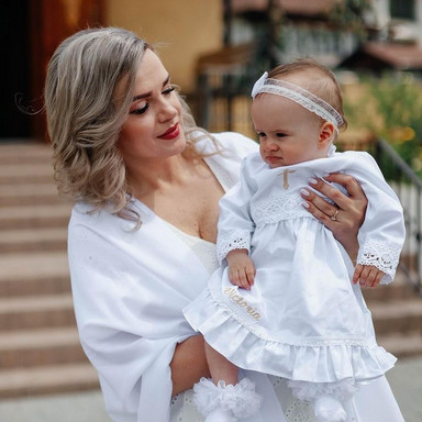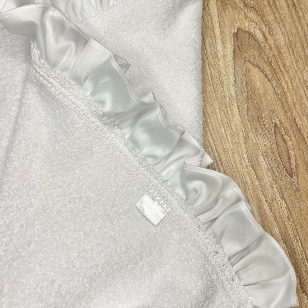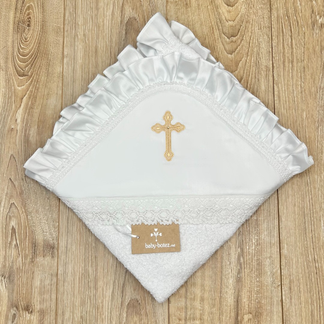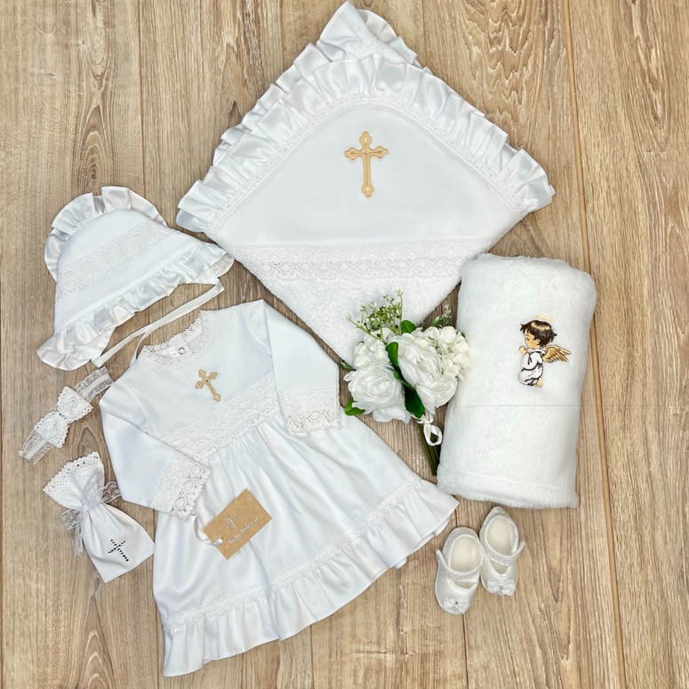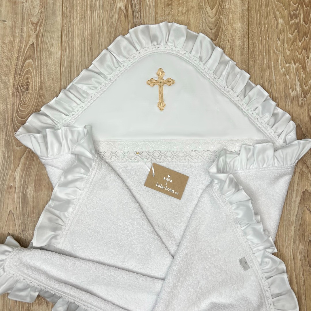 Compoziție prosop cu glugă, rochiță, bonetă, păturică, fundiță, săculeț, botoșei