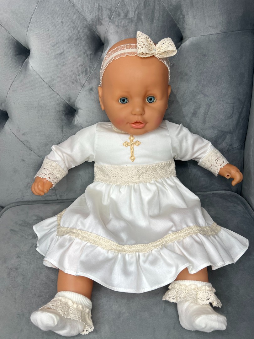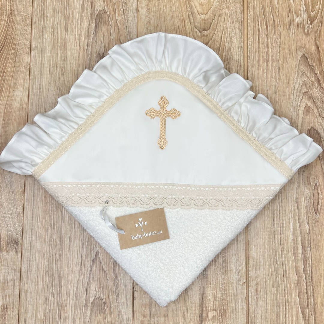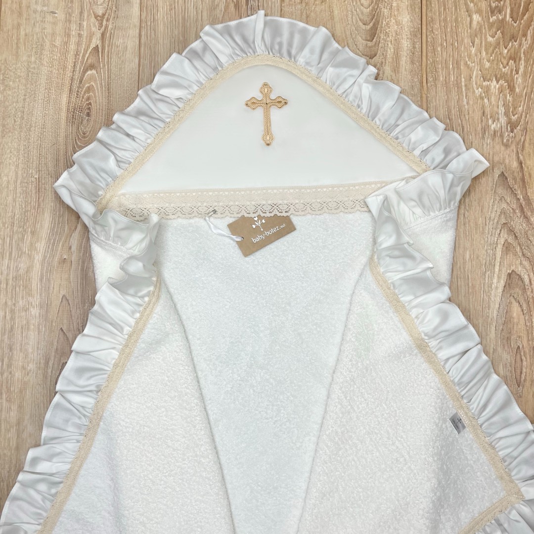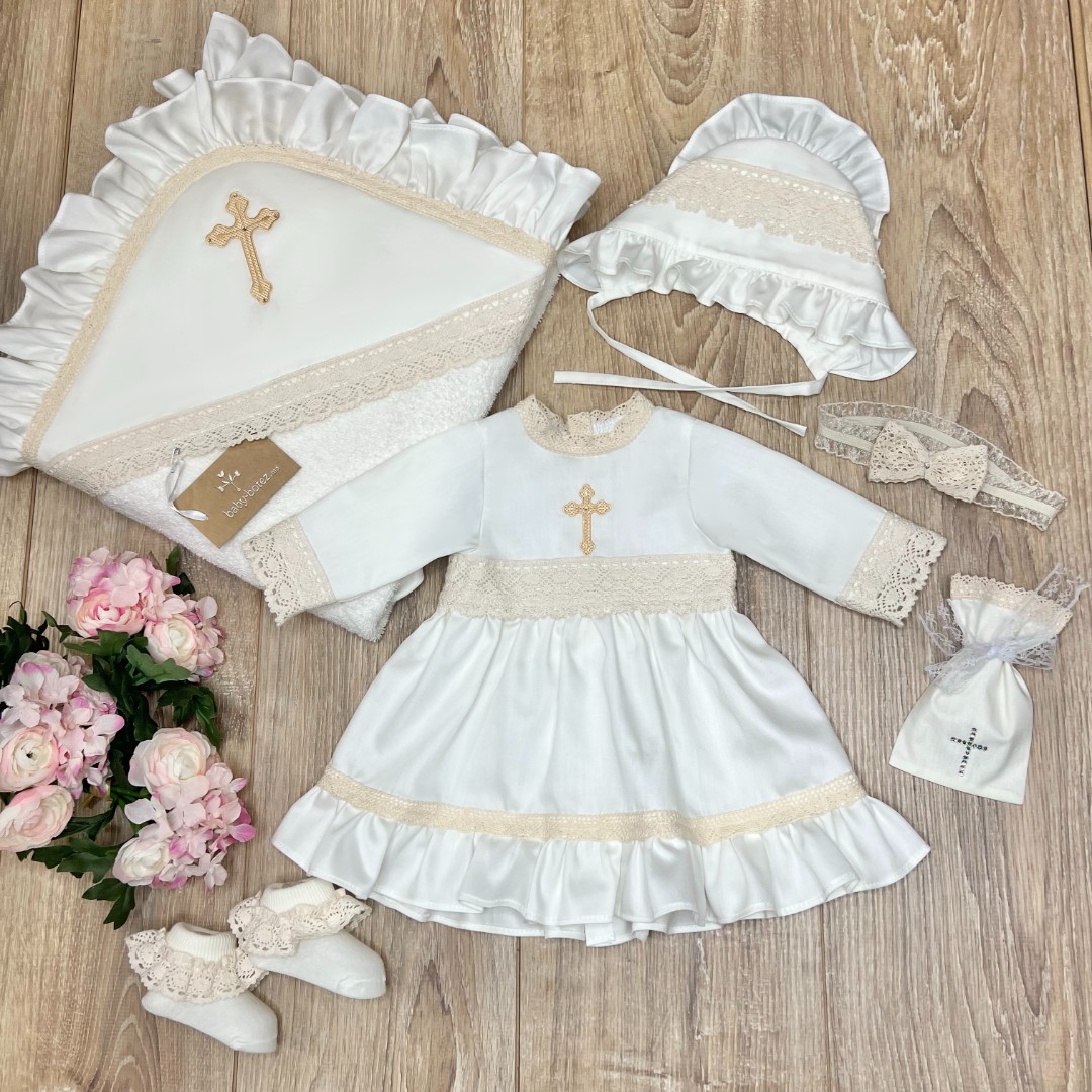 Compoziție prosop cu glugă, rochiță, bonetă, săculeț, fundiță, șosete