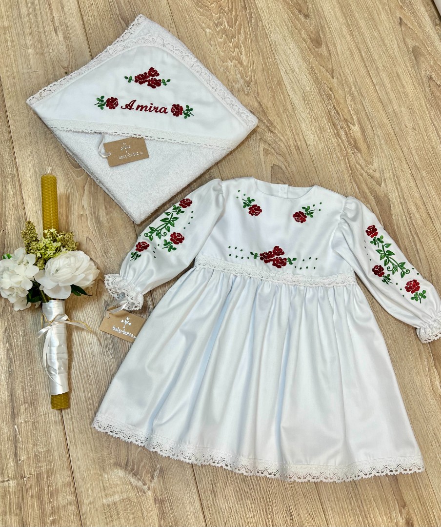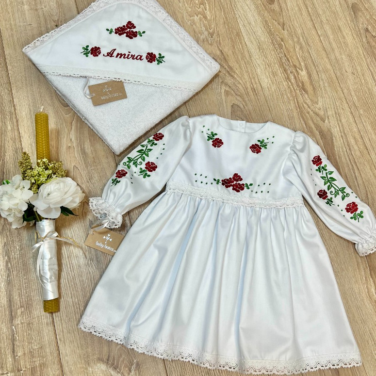 Compoziție prosop cu glugă, rochiță, lumânare cu buchet și busuioc