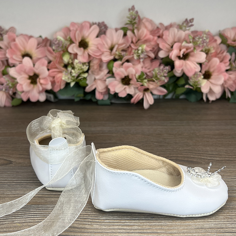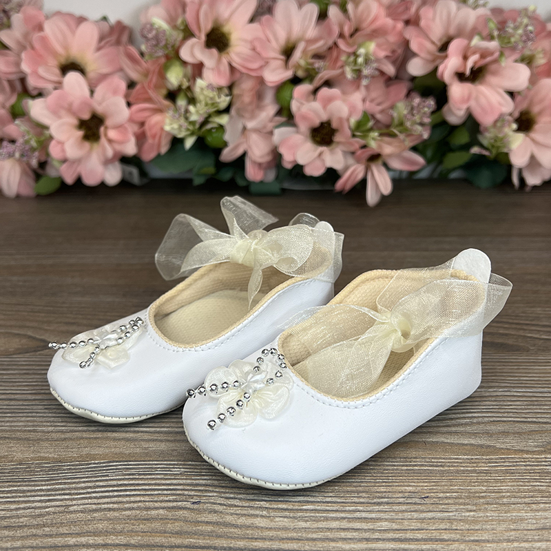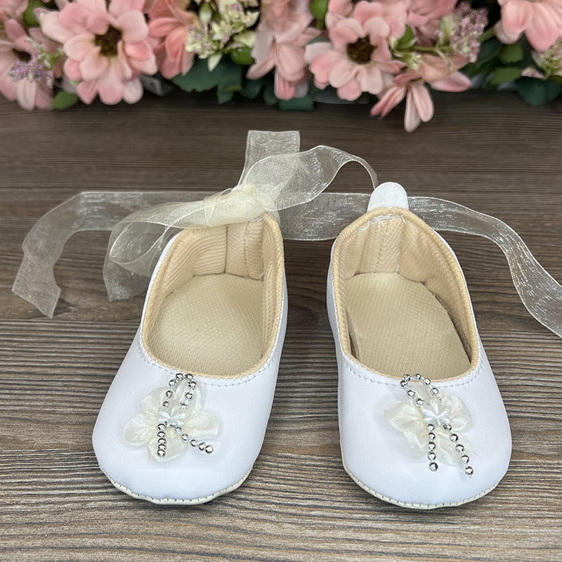 Aceste pantofi, confecționați din ecouder, sunt decorati cu un flori din țesătură și perle metalice, oferindu-le un aspect rafinat și elegant. Pentru confort și o fixare sigură, încălțămintea este prinsă pe piciorul copilului cu o panglică din organza, adăugând un plus de farmec și ușurință fiecărui pas.