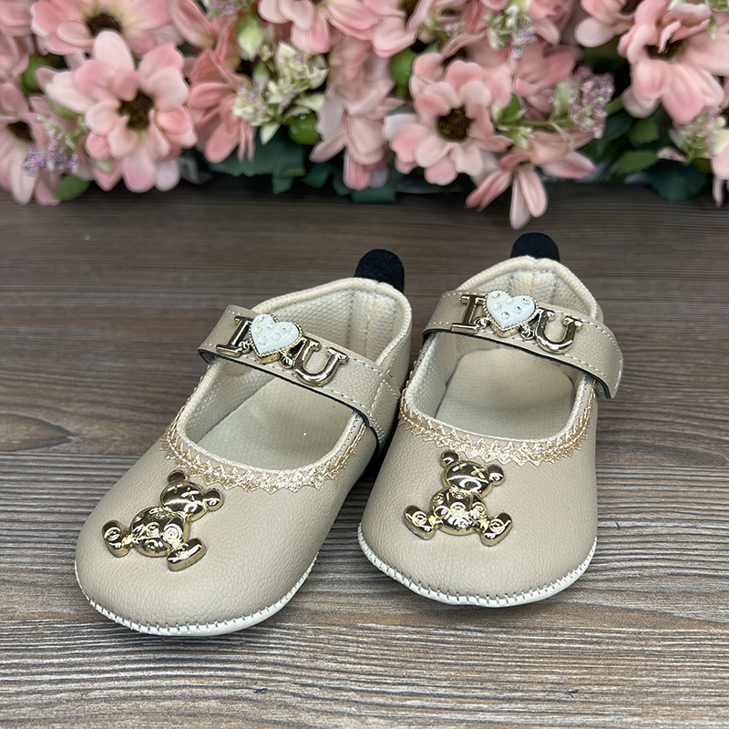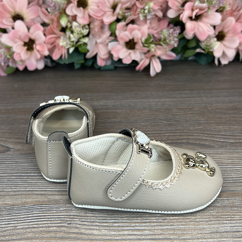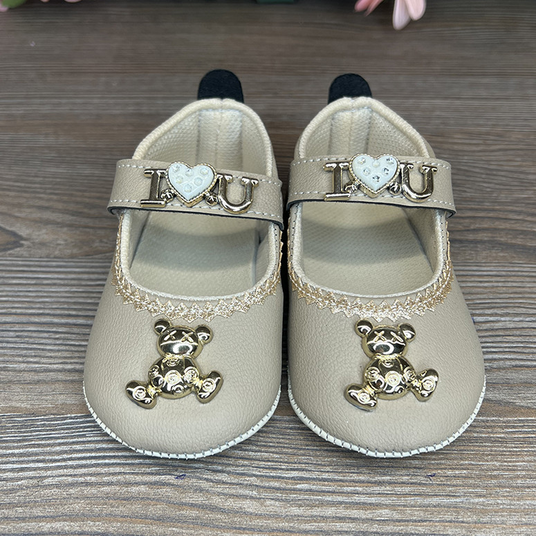 Pantofii cu ursuleț sunt un accesoriu drăgălaș și elegant pentru micile fashioniste. Pielea sintetică și broșa metalică în formă de urs adaugă un aspect unic și jucăuș încălțămintei. Închizătoarea cu arici asigură o fixare sigură, iar confortul și stilul fac din acești pantofi alegerea perfectă pentru orice ținută de zi cu zi.