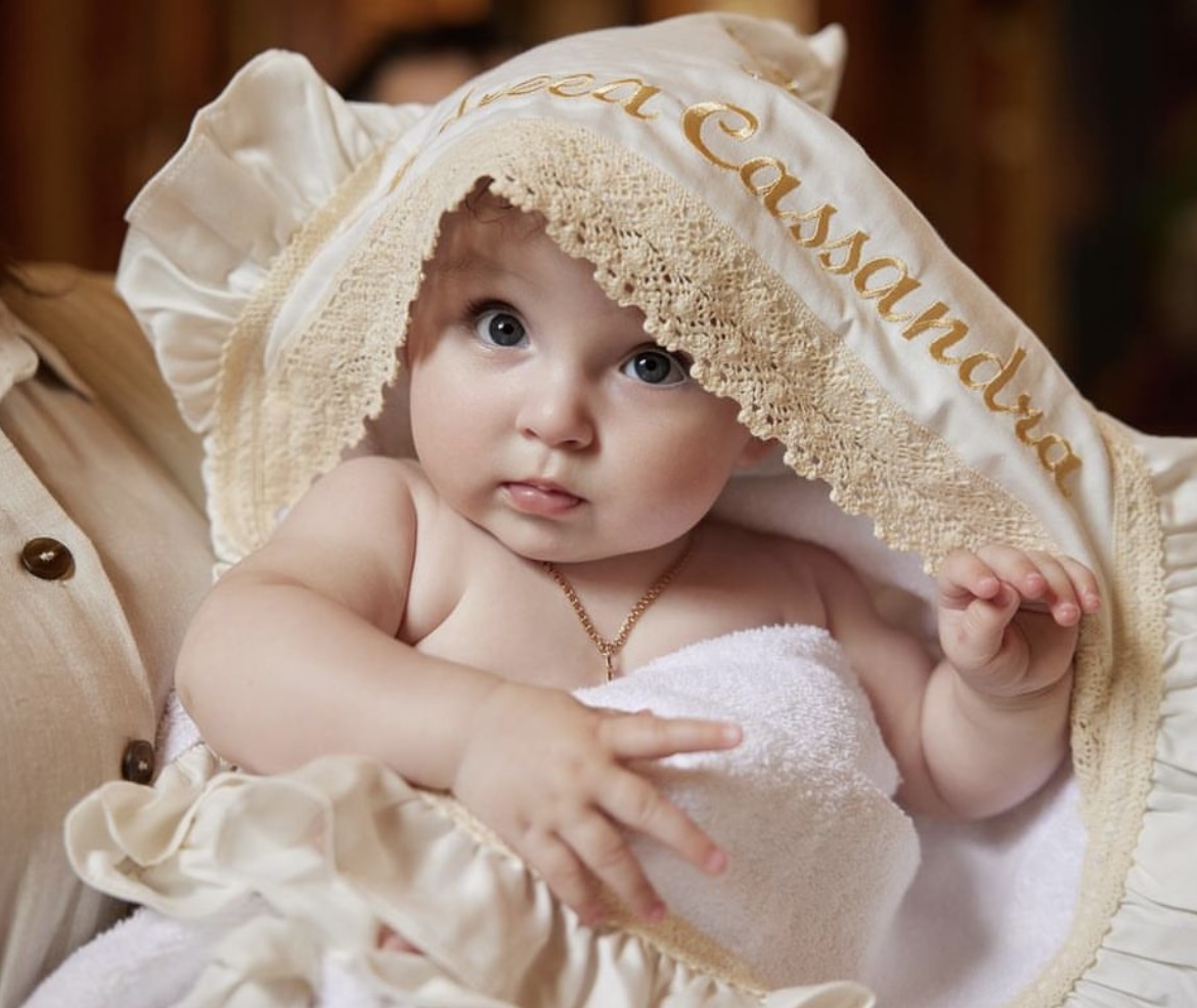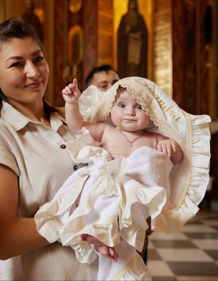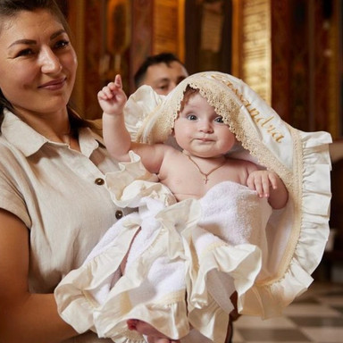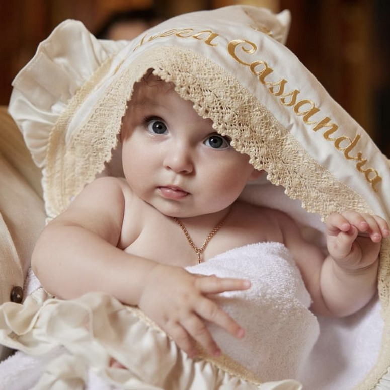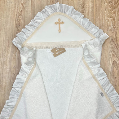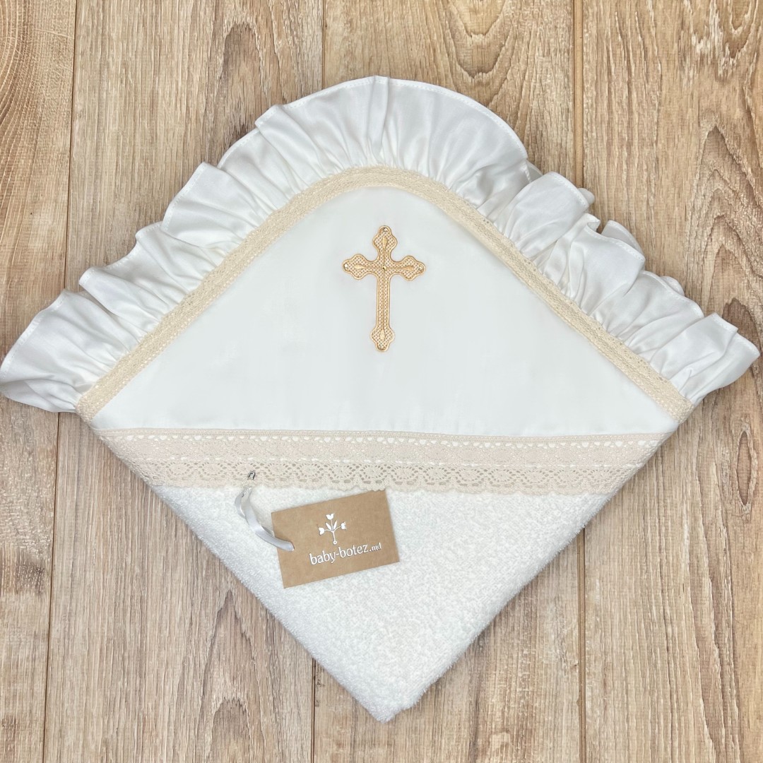 Prosop cu glugă, colț de prosop din prosop moale, decorat cu țesătură satinate și broderie. Margine din volan satinat