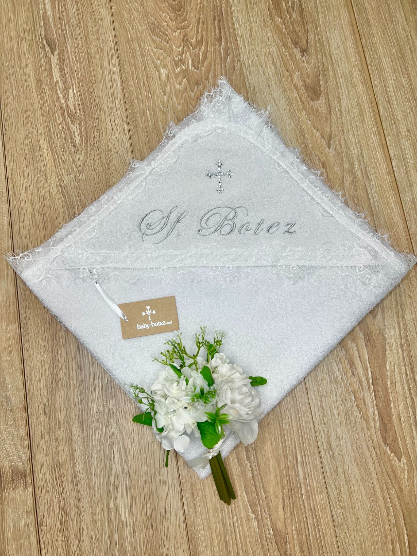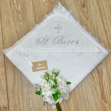 Prosop cu glugă, decorat cu dantelă franțuzească, cruce din strasuri și broderie