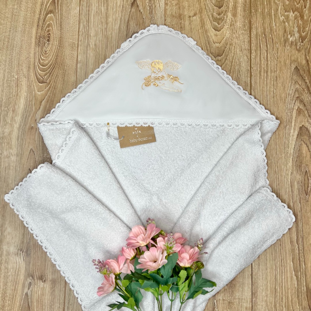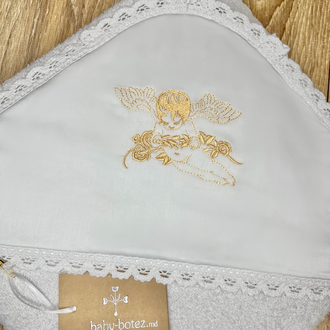 Prosop cu glugă, colț de prosop din prosop moale, decorat cu țesătură satinate și broderie. Margine din dantelă naturală