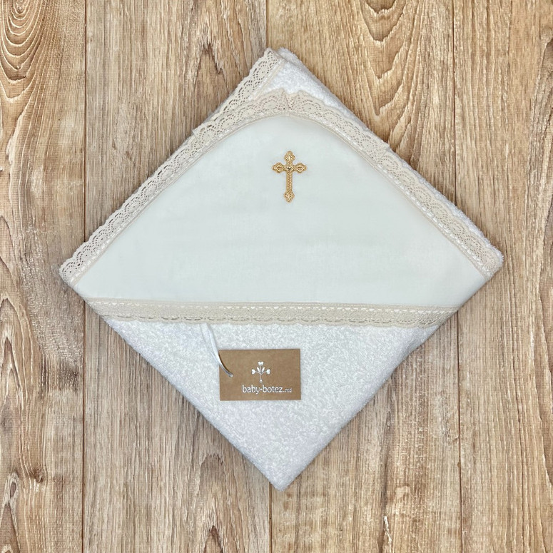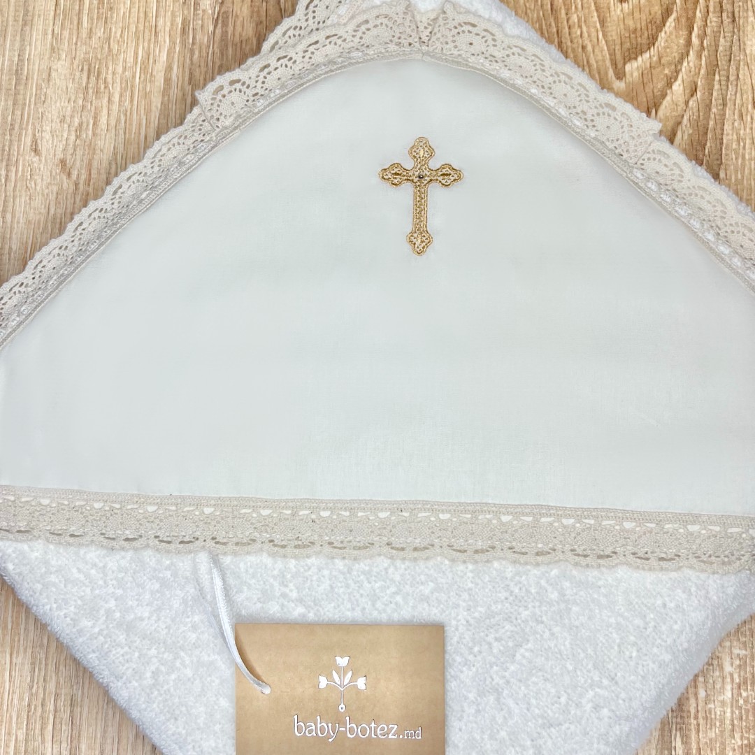Prosop cu glugă, colț de prosop din prosop moale, decorat cu țesătură satinate și broderie. Margine din dantelă naturală