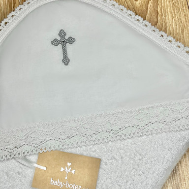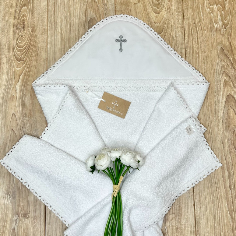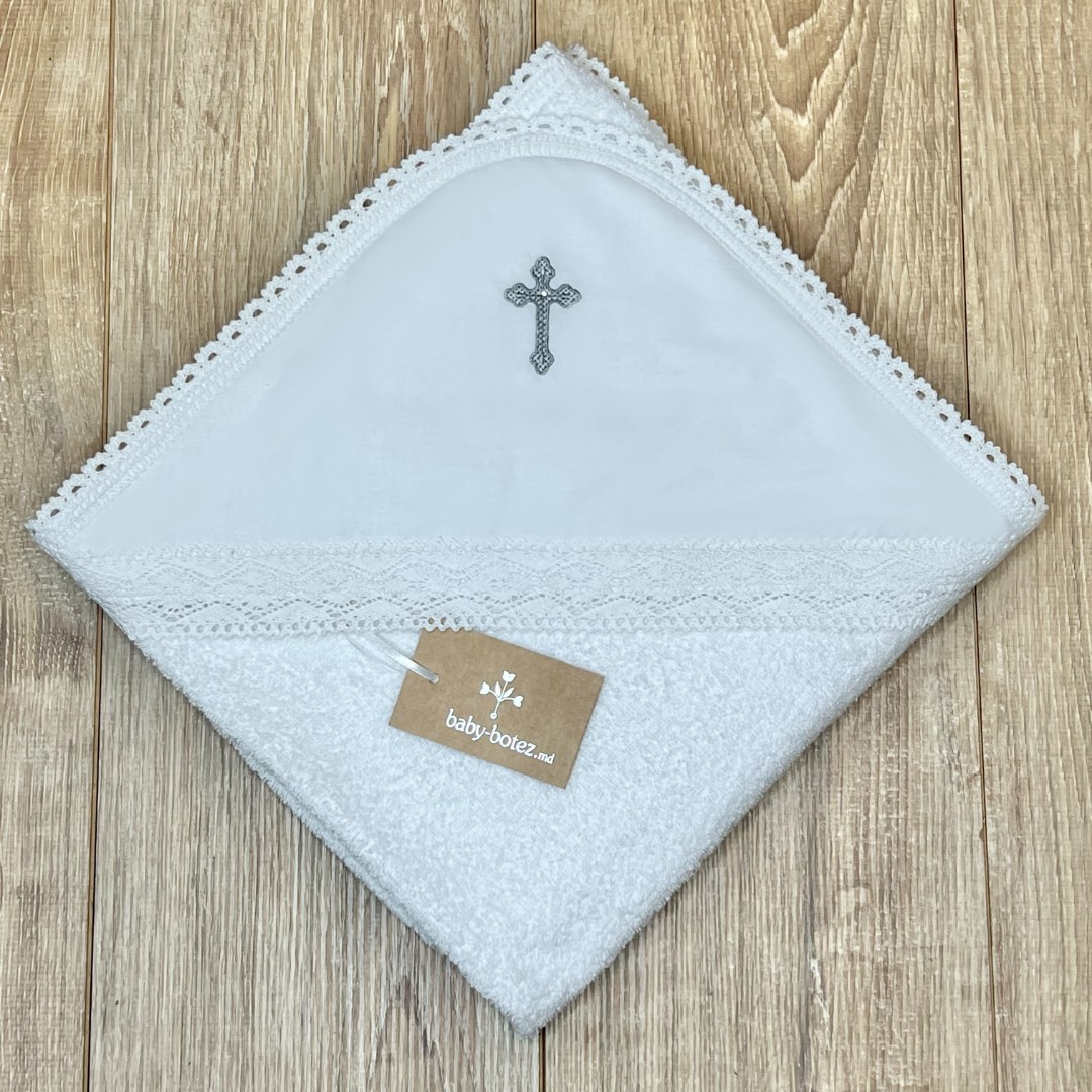 Prosop cu glugă, colț de prosop din prosop moale, decorat cu țesătură satinate și broderie. Margine din dantelă naturală