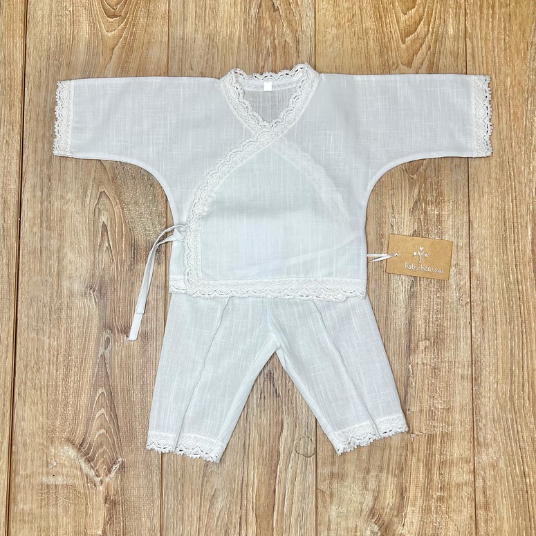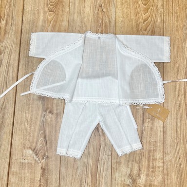Descriere Costum de botez, delicat și tradițional, realizat din in natural, care simbolizează puritatea și asigură confort bebelușului