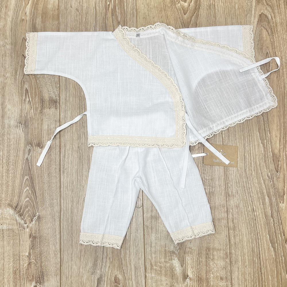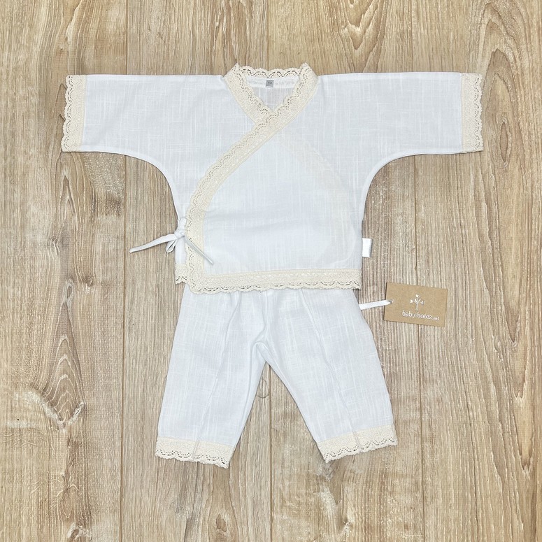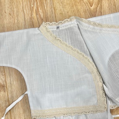 Descriere Costum de botez, delicat și tradițional, realizat din in natural, care simbolizează puritatea și asigură confort bebelușului