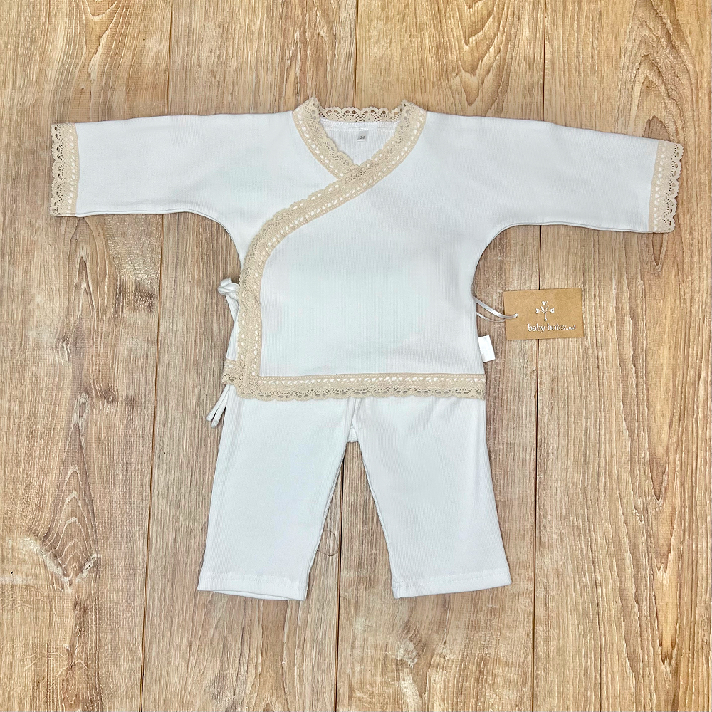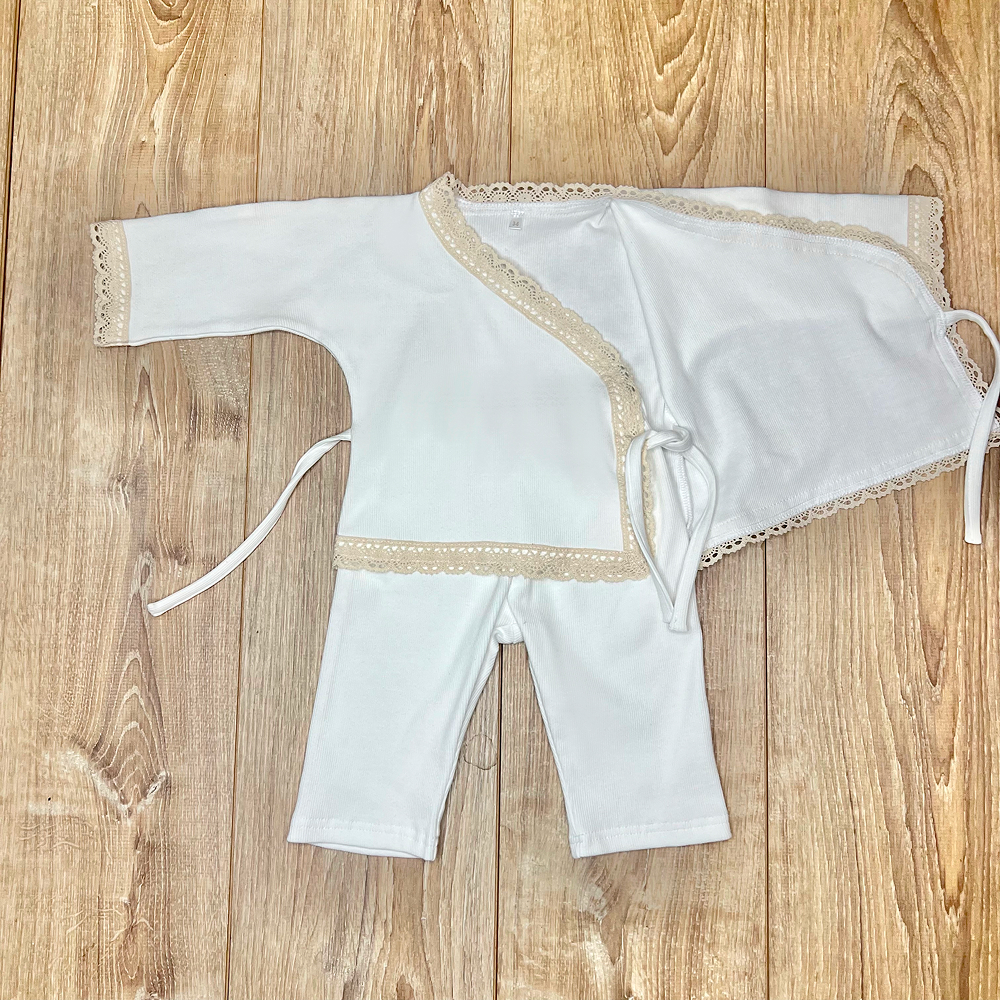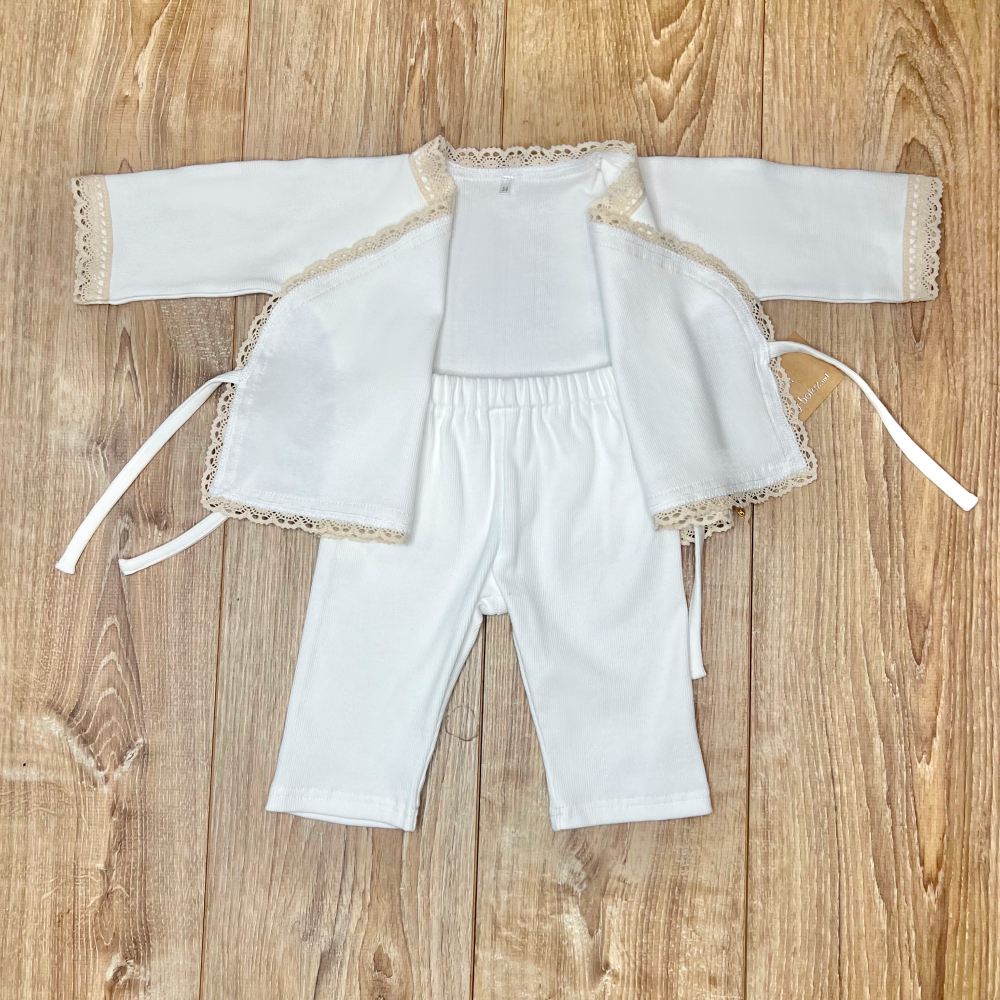 Descriere Costum din tricot cu închidere peste, combinând delicatețea unui costum clasic cu confortul maxim necesar în timpul Tainei Botezului