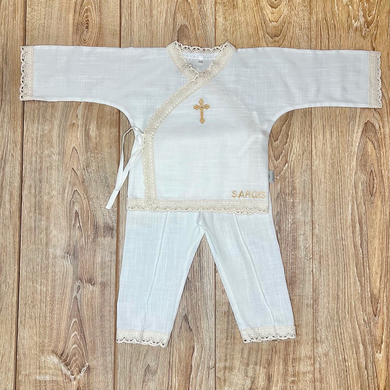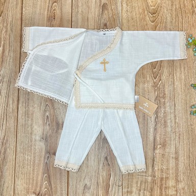 Descriere Costum de botez, delicat și tradițional, realizat din in natural, care simbolizează puritatea și asigură confort bebelușului
