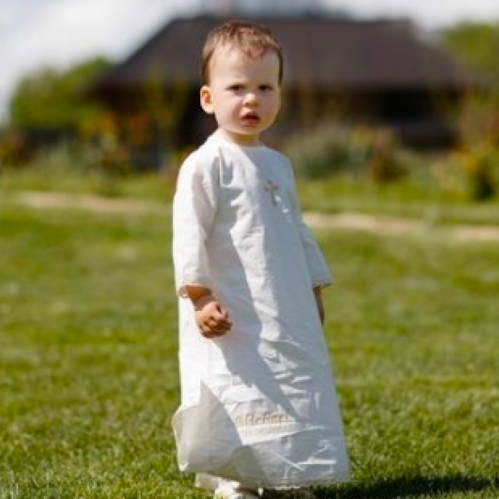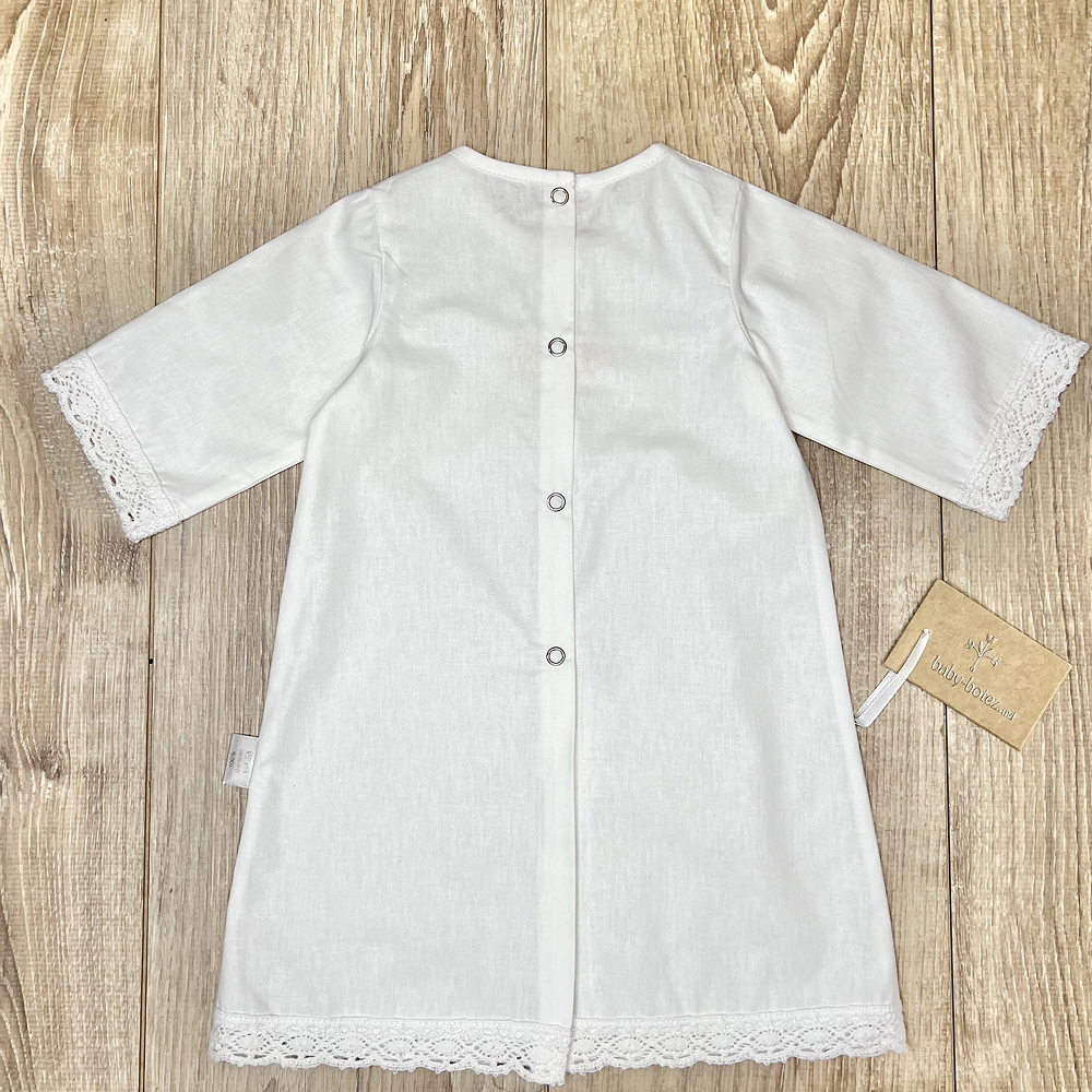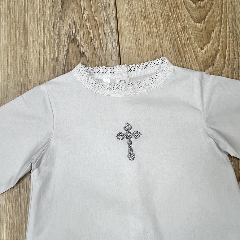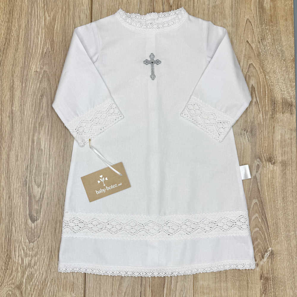 | Descriere | Cămașă clasică de botez, croială tradițională, simbolizând puritatea și începutul unei vieți noi. Nu restricționează mișcările bebelușului și permite îmbrăcarea ușoară după ritualul de spălare |