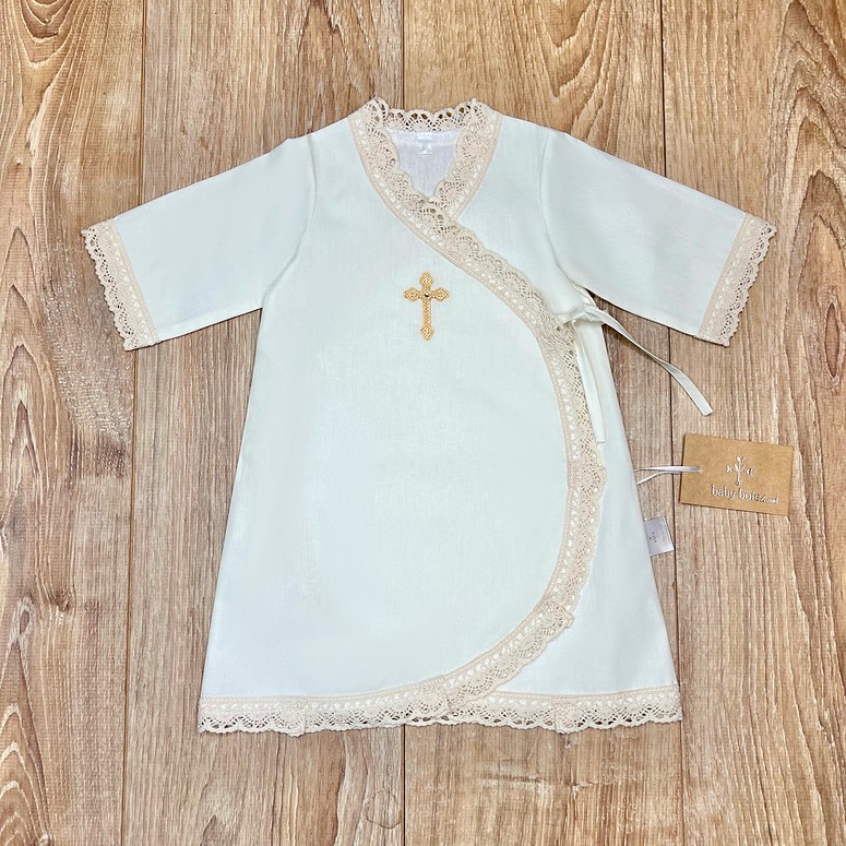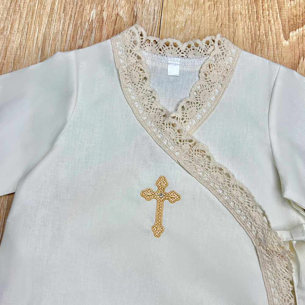 | Descriere | Cămașă clasică de botez, croială tradițională, simbolizând puritatea și începutul unei vieți noi. Nu restricționează mișcările bebelușului și permite îmbrăcarea ușoară după ritualul de spălare |
