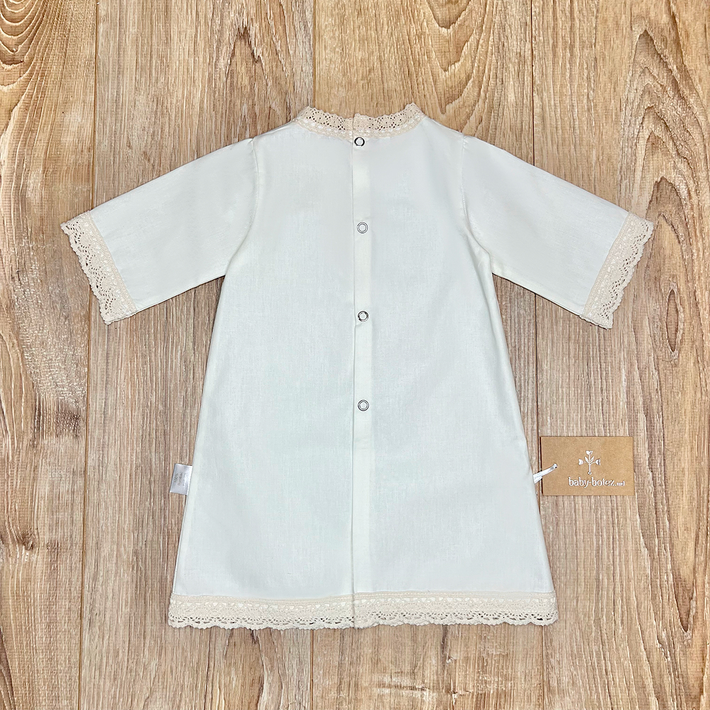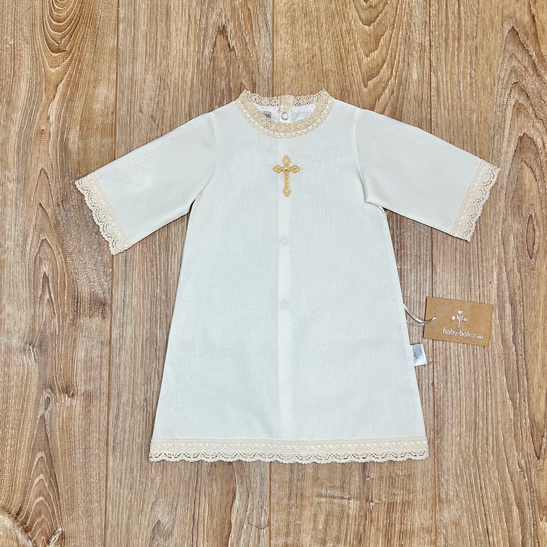 | Descriere | Cămașă clasică de botez, croială tradițională, simbolizând puritatea și începutul unei vieți noi. Nu restricționează mișcările bebelușului și permite îmbrăcarea ușoară după ritualul de spălare |