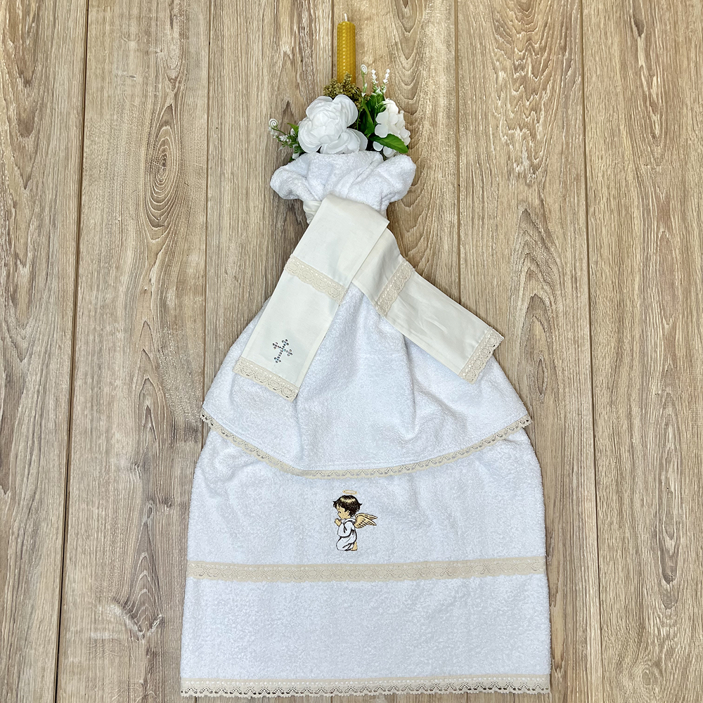 Componență prosop, panglică pentru botez, lumânare din ceară naturală cu busuioc și flori artificiale