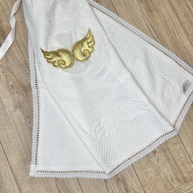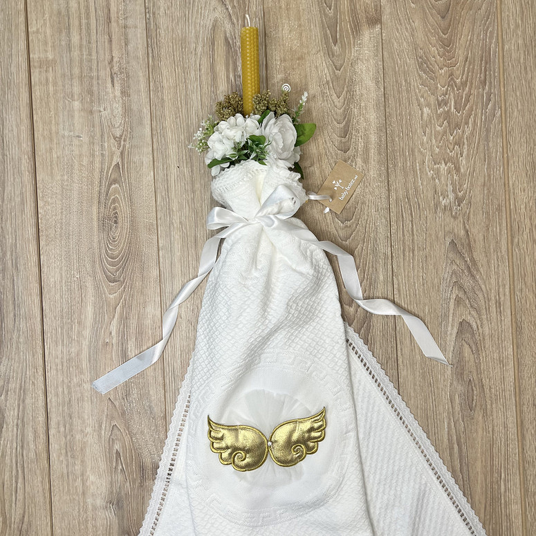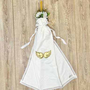Componență cuvertură cu aripi aurii, lumânare din ceară naturală cu busuioc și flori artificiale