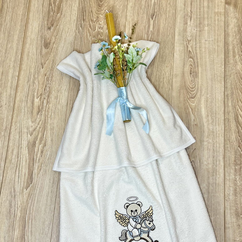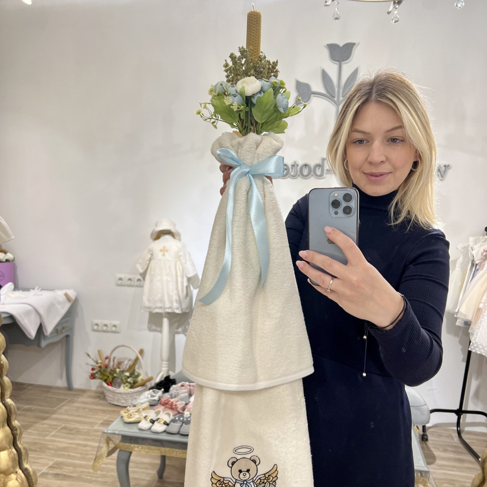 Componență prosop, lumânare din ceară naturală cu busuioc și flori artificiale
