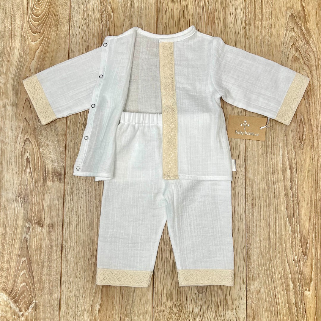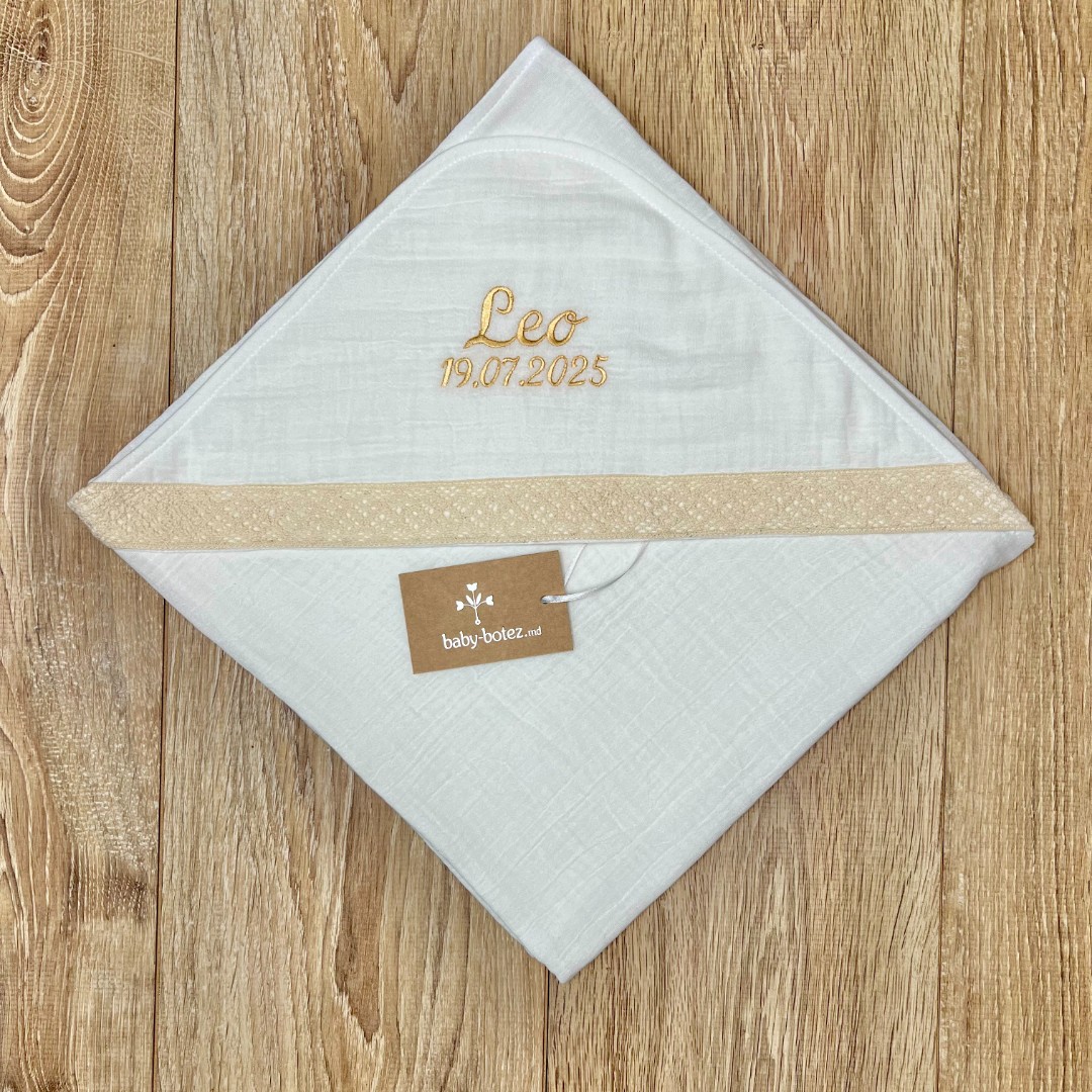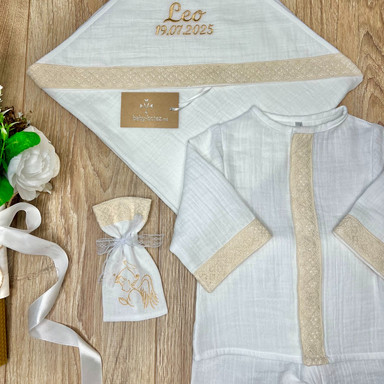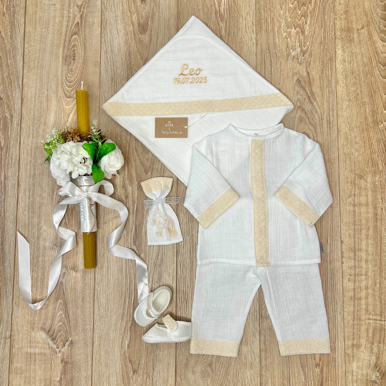 Compoziție Costum, scutec cu glugă, botoșei, săculeț, lumânare cu buchet