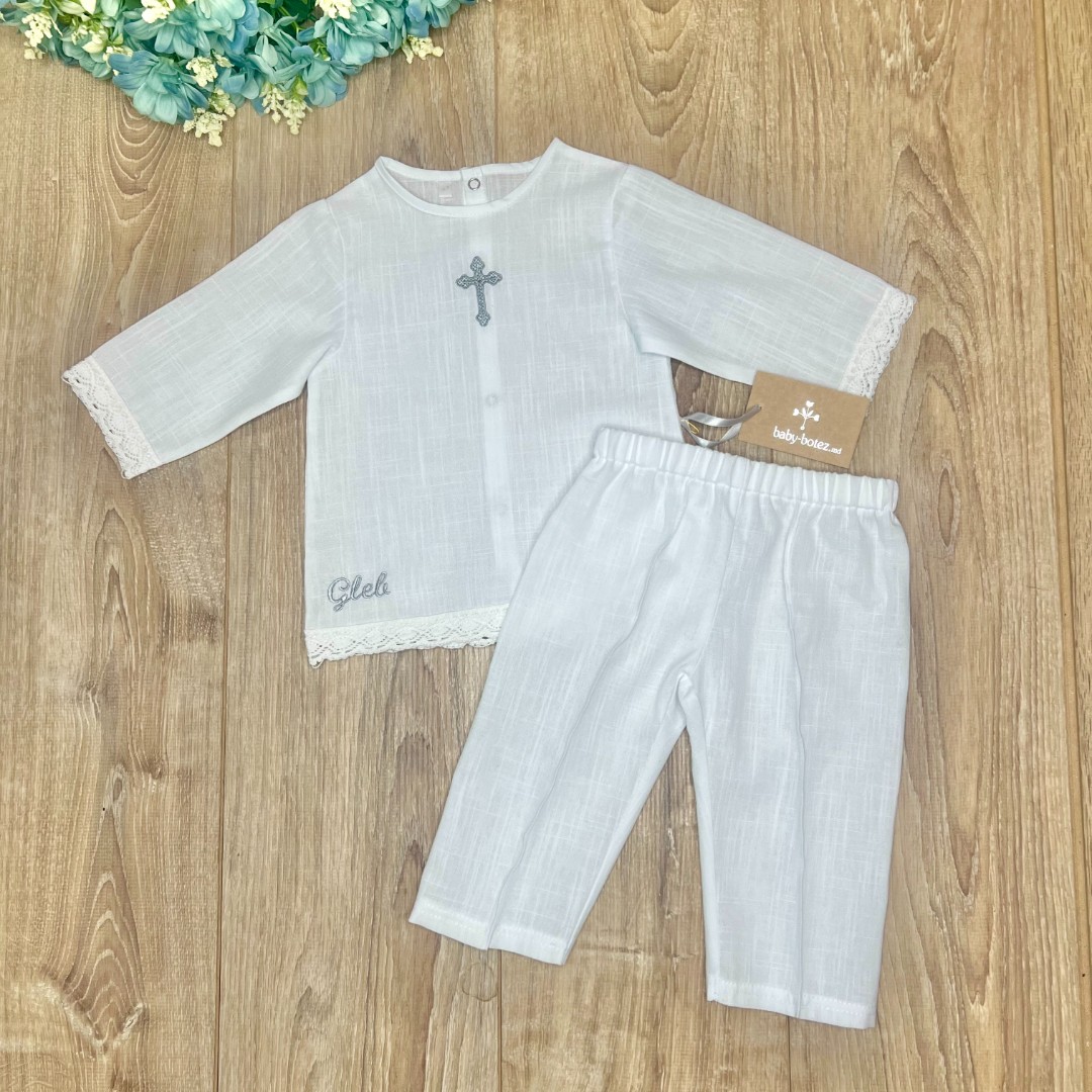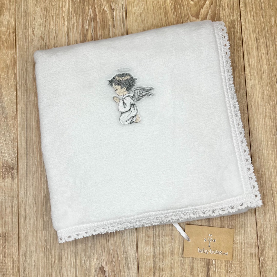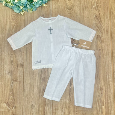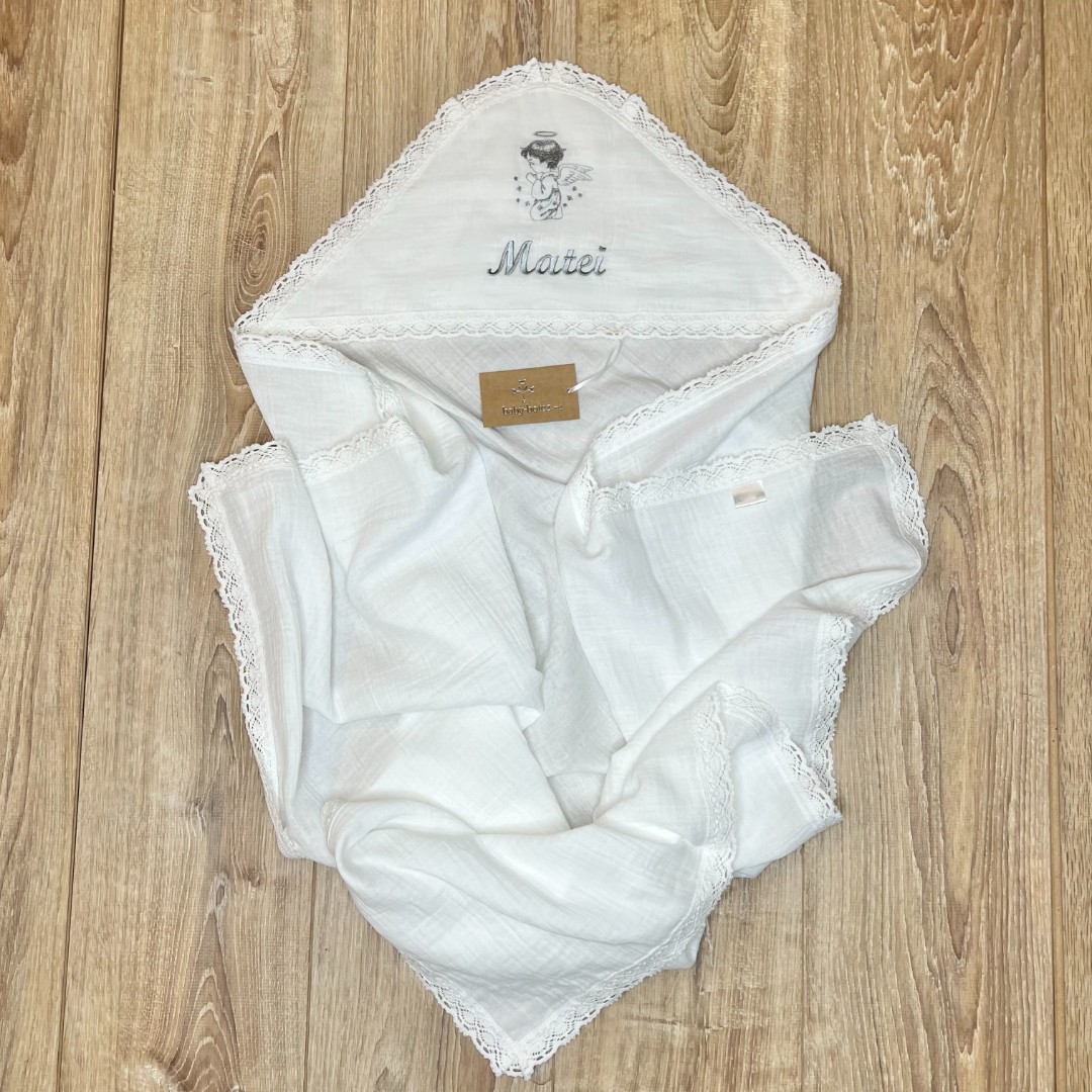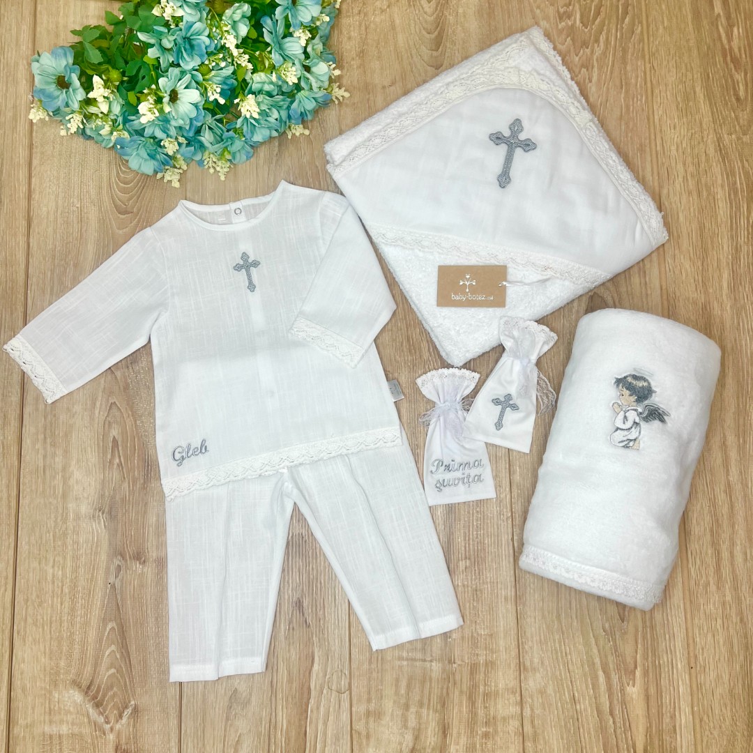 Compoziție Costum, prosop cu glugă, pled, săculeț pentru cruciuliță, săculeț pentru prima șuviță
