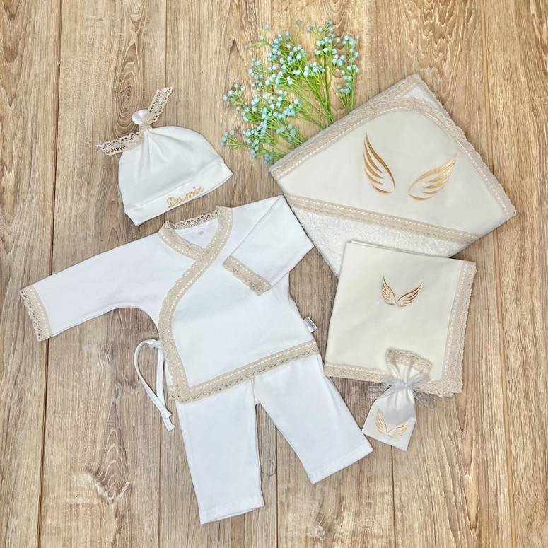 Compoziție Costum, prosop cu glugă, scutec, căciuliță, săculeț