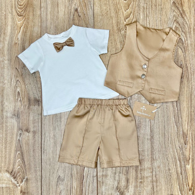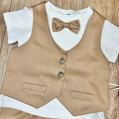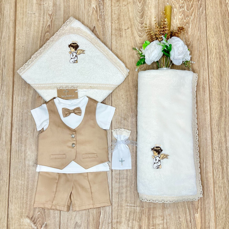 Compoziție Costum, tricou cu papion, prosop cu glugă, plăpumioară, săculeț, lumânare cu buchet