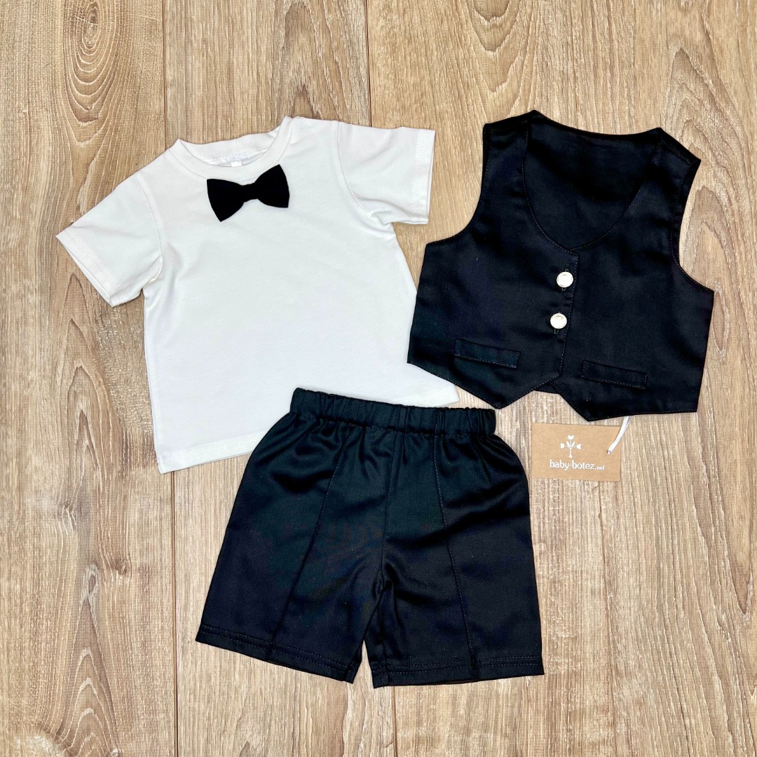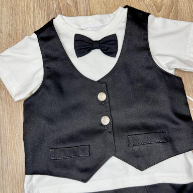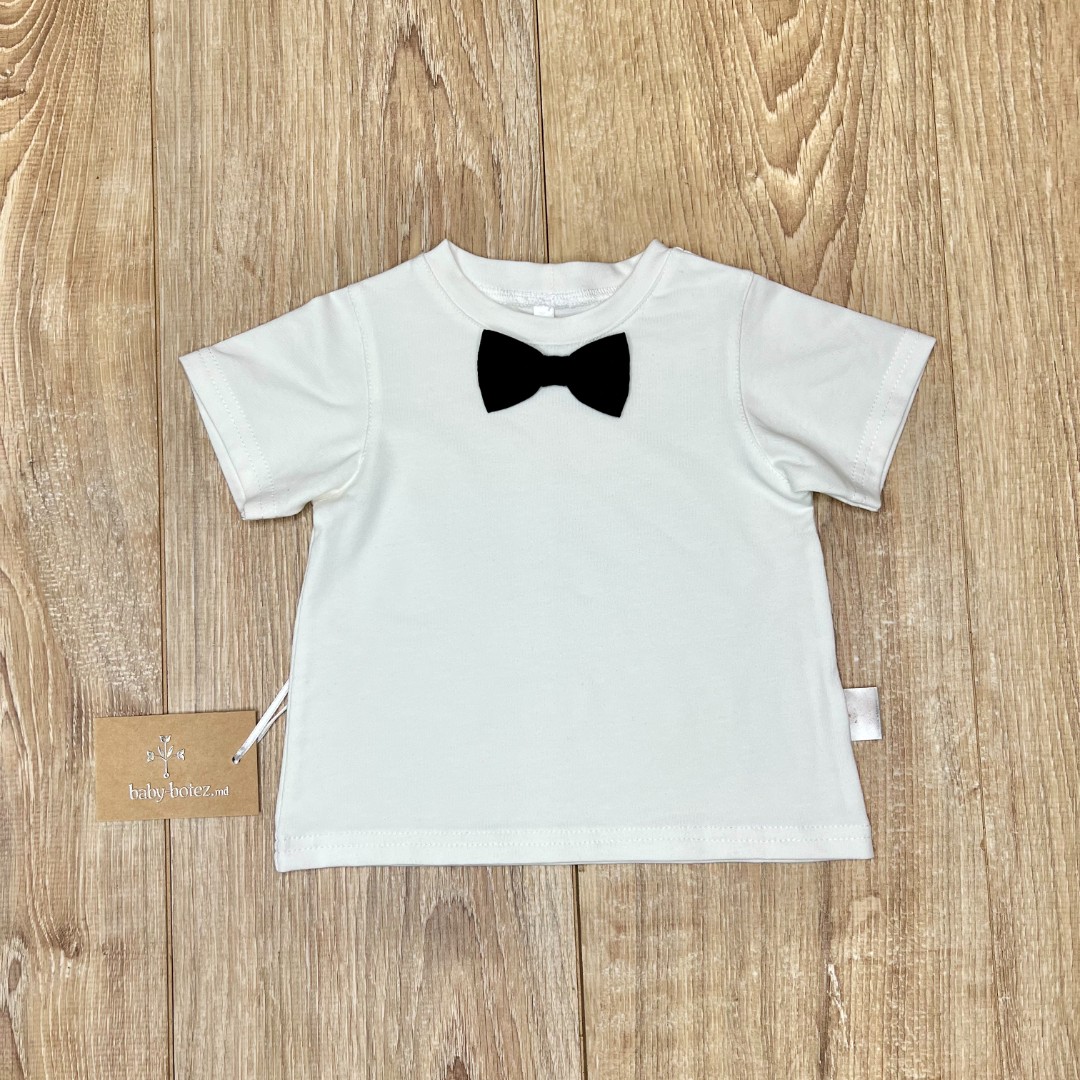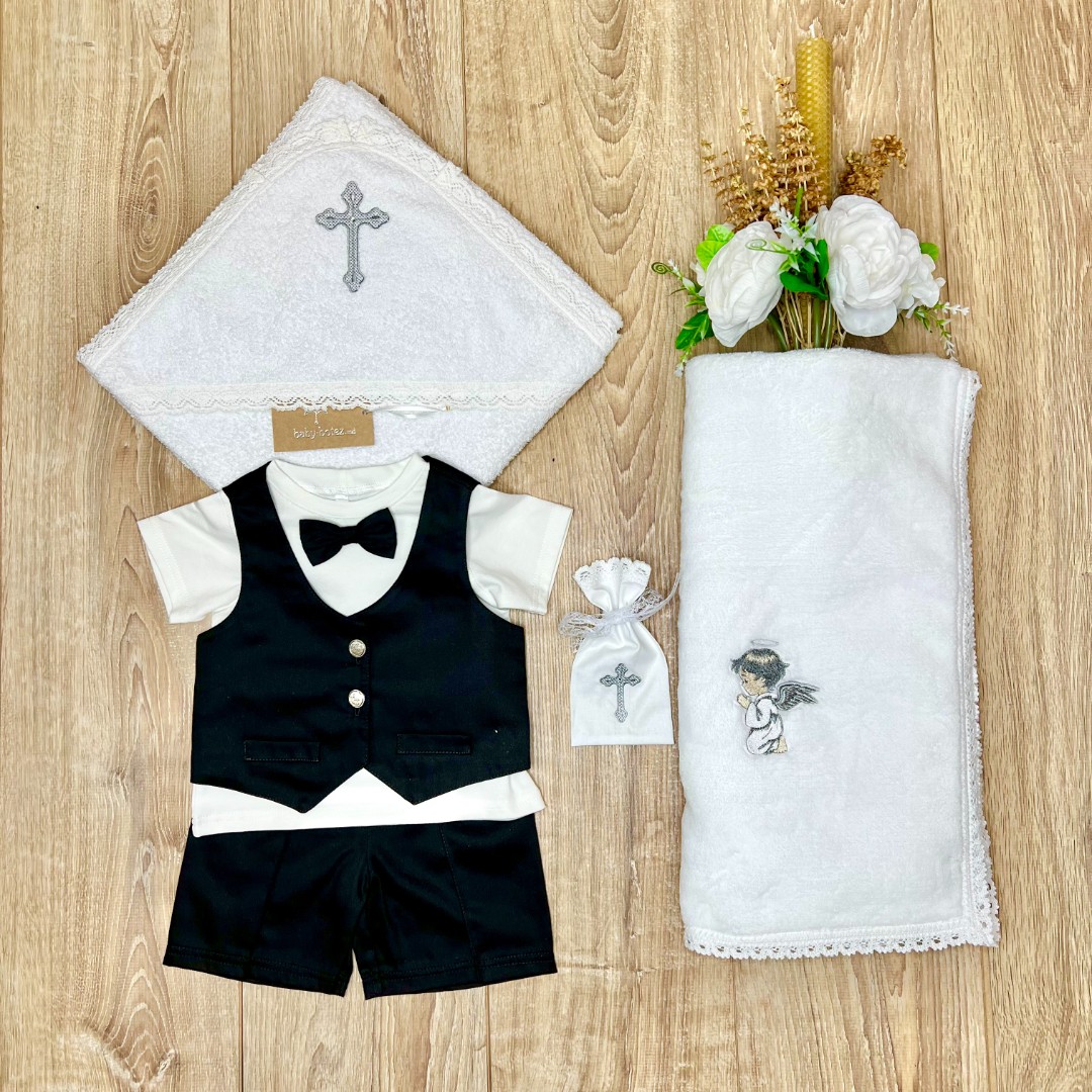 Compoziție Costum, tricou cu papion, prosop cu glugă, plăpumioară, săculeț, lumânare cu buchet